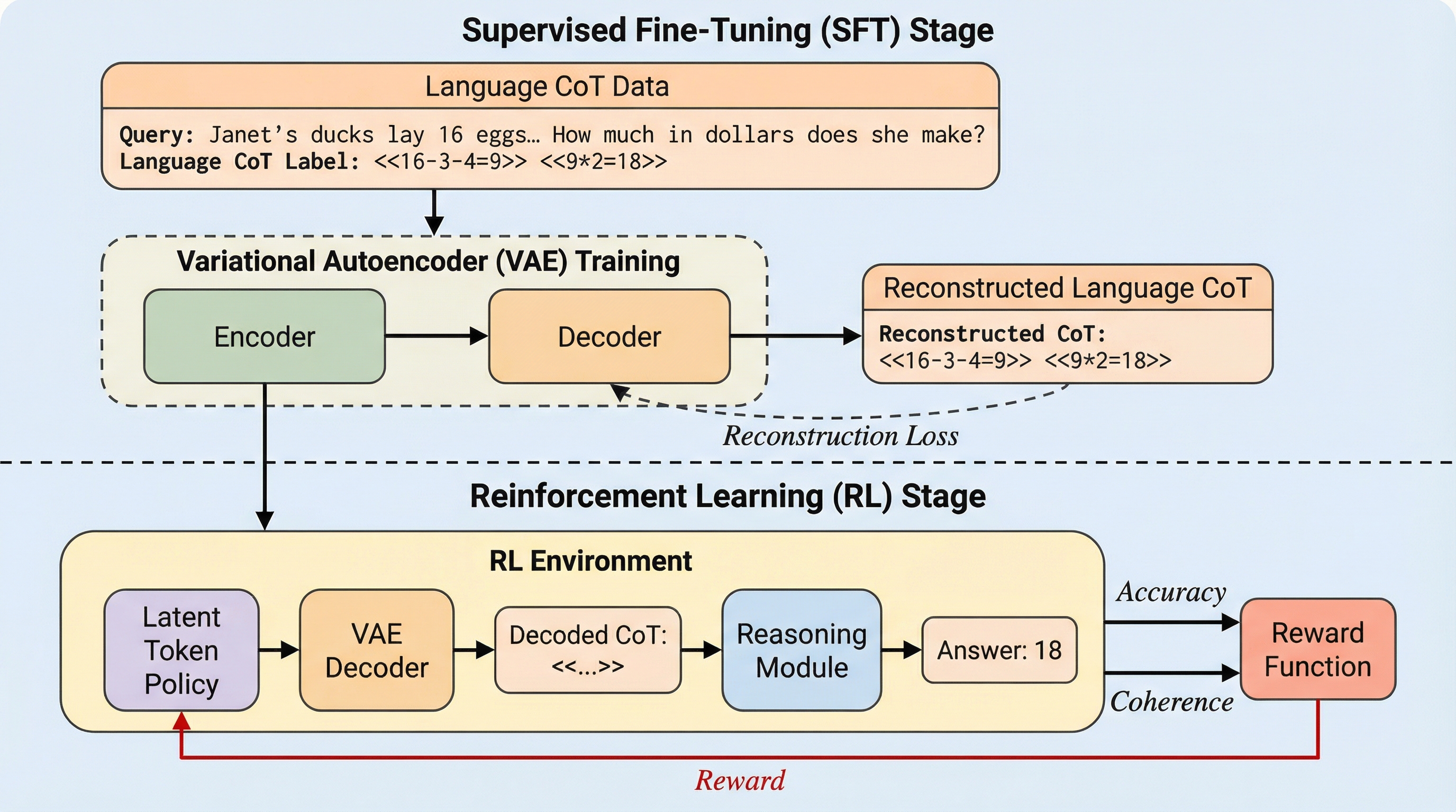 本研究が提案する「ATP-Latent(Active Latent Planning)」は、潜在トークンの生成プロセスを能動的な計画問題として捉え直し、二段階のアプローチで最適化する新しい手法です。第一段階の教師あり学習(SFT)では、従来の模倣学習を拡張し、変分オートエンコーダ(VAE)の枠組みを導入しています。ここでは、LLMをエンコーダとして機能させ、潜在トークンを生成すると同時に、別のLLMをデコーダとして用いて、その潜在トークンがどのような言語的意味を持っているのかを復元させます。このプロセスにより、潜在空間は単なる数値の羅列ではなく、意味的に整合性の取れた滑らかで均一な表現空間へと変貌します。…
