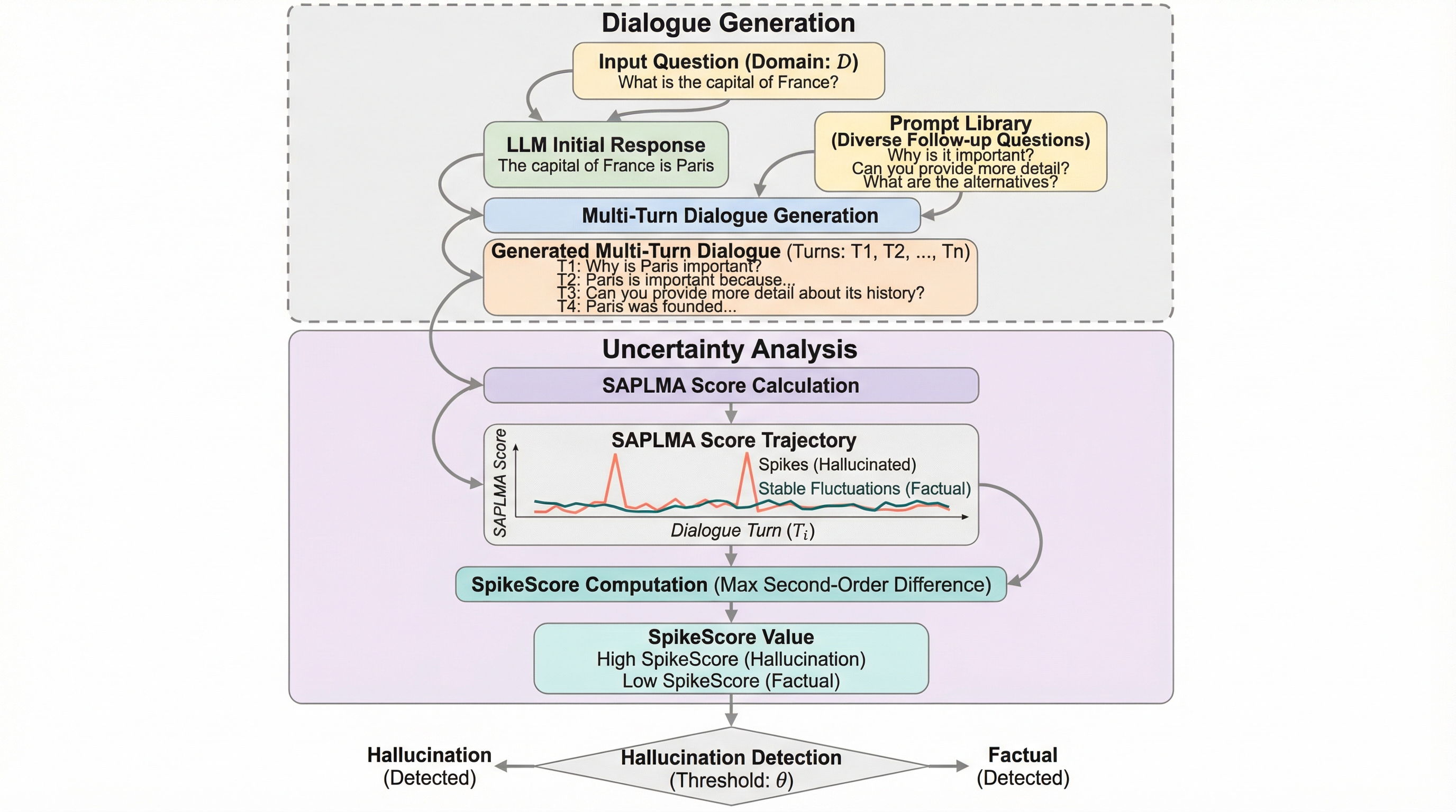 大規模言語モデル(LLM)のハルシネーション検知において、訓練データと異なる領域で精度が低下する「クロスドメイン汎用性」の欠如を解決するため、単一ドメインの学習のみで多様な未知の領域に対応できる汎用的検知(GHD)の枠組みを確立しました。 ハルシネーションから始まる多ターン対話では、事実に基づく対話よりもモデル内部の不確実性の変動が激しくなる現象に着目し、対話の過程で生じる不確実性スコアの急激な変化を二階差分によって定量化する新指標「SpikeScore」を開発しました。 複数のモデルとベンチマークを用いた実験により、SpikeScoreは既存の汎用性重視の手法を上回る精度を示し、理論的な分離可能性の証明とともに、教育や医療などの安全性が重視される実社会の多様な応用におけるLLMの信頼性を高める有効性を実証しました。