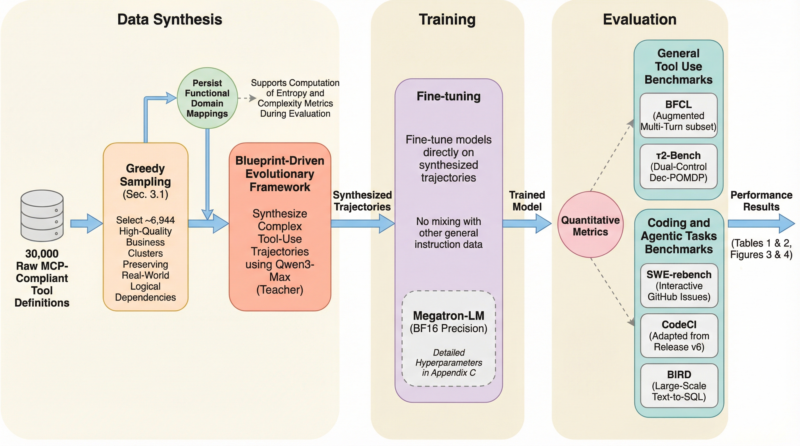 本研究は、データの量(Quantity)ではなく多様性(Diversity)に焦点を当てた合成データ生成フレームワーク「TDScaling(Trajectory Diversity Scaling)」を提案しています。このフレームワークの核心は、限られたトレーニング予算の中で、軌跡の多様性を高めることが、単に軌跡の数を増やすことよりも大きな性能向上をもたらすという「多様性スケーリング」の概念を確立した点にあります。TDScalingは、主に4つの革新的な要素で構成されています。 第一に、現実のサービスの論理的な依存関係を再現するために、MCPサーバーを「ビジネスクラスタ」として整理する仕組みを導入しました。これにより、個々のAPIをバラバラに扱うのではなく、関連するツール群を一つのサービス単位として捉え、意味的な広がりを最大化するようにサンプリングすることが可能になります。…