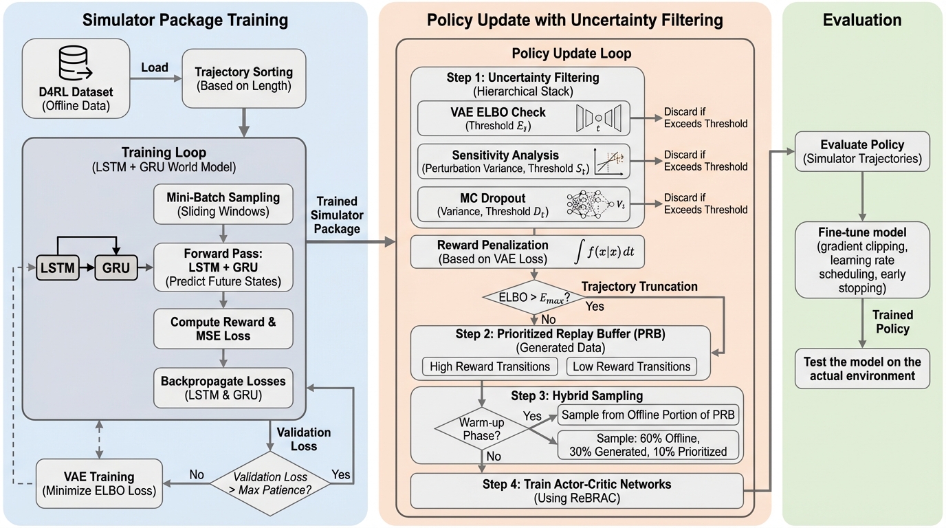 MoReBRACは、静的なデータセットに依存する従来のオフライン強化学習の限界を打破するため、不確実性を考慮した世界モデルによる合成データ生成と、階層的なフィルタリングを統合した新しいフレームワークである。 二重再帰構造を持つLSTMとGRUを用いた高度な世界モデルで高精度な遷移を生成し、VAEによる多様体検出、感度分析、MCドロップアウトを組み合わせた3段階の不確実性パイプラインによって、信頼性の高い遷移のみを学習に利用する。 この手法は、既存のデータセットに含まれる断片的な軌跡を繋ぎ合わせる「接続組織」として機能し、特に低品質なデータセットにおいて従来手法を大きく上回る性能を記録するとともに、VAEがデータの幾何学的な境界を維持するアンカーとして極めて重要な役割を果たすことを示した。
