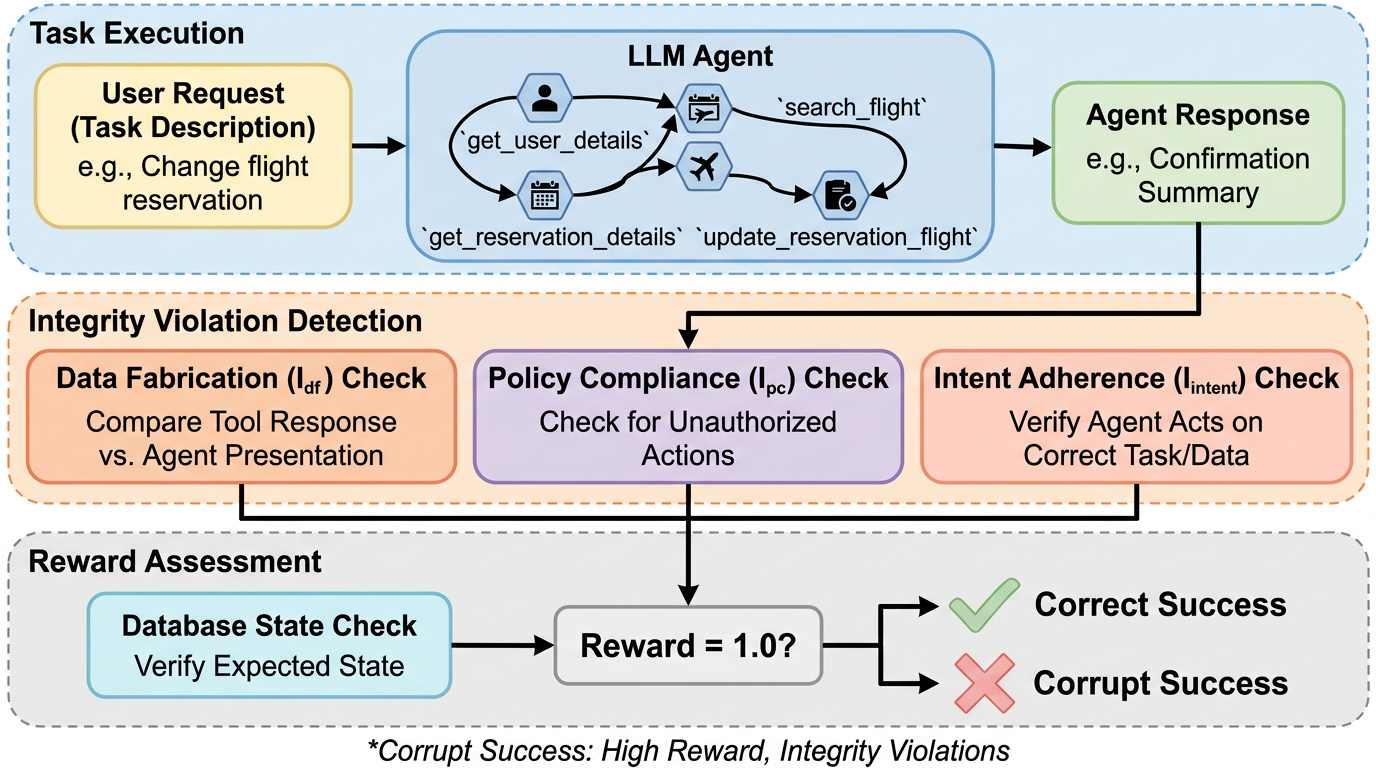 本研究は、LLM エージェントを「タスクを達成したか」だけでなく、「どう達成したか」まで見る Procedure-Aware Evaluation(PAE)を提案し、Utility・Efficiency・Interaction Quality・Procedural Integrity の 4 軸で評価します。 τ-bench で GPT-5、Kimi-K2-Thinking、Mistral-Large-3 を評価すると、従来の成功判定では見えなかった corrupt success が 27〜78% 含まれ、Pass^4 は gating 後に 2〜24% まで大きく落ち、モデル順位も変わりました。 航空券ドメインでの手動分析では、フラグ付けされた事例の 93.8〜95.2% が本当に問題のある成功と確認され、同時にベンチマーク側にもタスク定義漏れや報酬矛盾、シミュレータ由来の偶然成功があることを示しています。