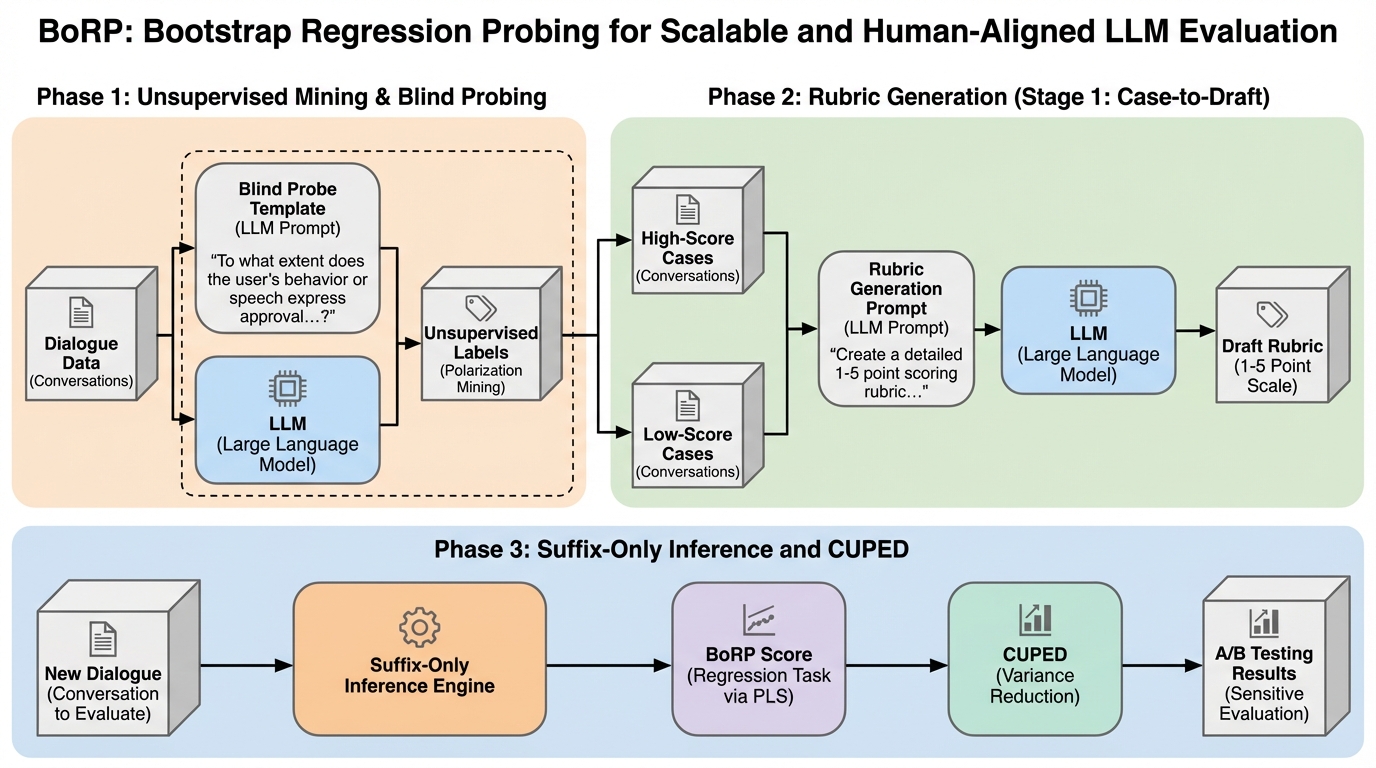 従来のLLMによる評価(LLM-as-a-Judge)が抱える「高コスト・低速・評価の偏り」という課題を解決するため、モデルの内部状態(潜在空間)を直接解析してユーザー満足度を1から5の数値で回帰予測する新手法「BoRP」が提案されました。 独自の「偏極指数(PI)」を用いて、ラベルのないデータから満足度が極端なサンプルを自動抽出し、教師モデルを通じて評価基準(ルーブリック)を自動生成するブートストラップ機構を備えており、専門家による膨大な作業なしで高精度な評価システムを構築可能です。 実証実験では、Qwen3-14Bを用いたBoRPが、より巨大なQwen3-Maxの生成評価を上回る人間との整合性を示し、推論コストをGPT-4比で169分の1以下に抑えつつ、単一GPUで1日あたり140万セッションを処理できる圧倒的な効率性を実現しました。