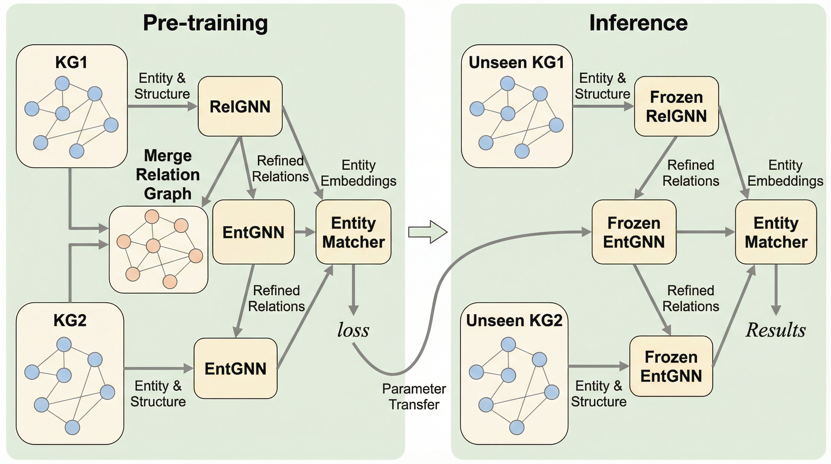 エンティティ・アライメント(EA)は知識グラフ統合の要であるが、既存手法は学習時のデータに依存するトランスダクティブな性質を持つため、未知のグラフに対して再学習なしで適用できないという転移性の欠如が長年の課題であった。