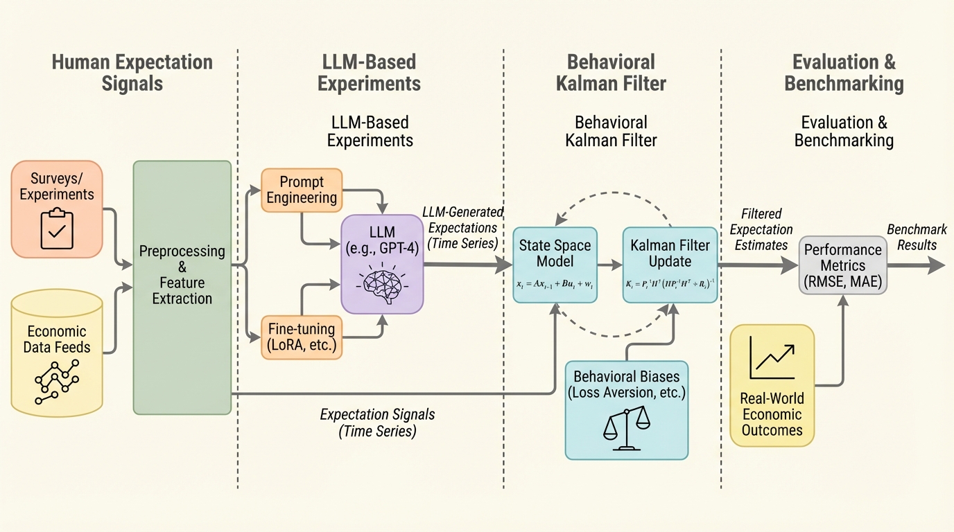 大規模言語モデル(LLM)を家計や企業の最高経営責任者(CEO)といった経済主体として扱い、個人の所得変化(ミクロ信号)と国全体の経済成長(マクロ信号)をどのように統合して将来予測を行うかを、新たに提案した「行動カルマンフィルター(BKF)」を用いて定量化した。 実験の結果、LLMはマクロ信号よりも身近なミクロ信号を極めて重視する傾向があり、複数の情報源が同時に存在すると各信号への信頼や重みが相互に干渉して減少する「認知的割引」現象や、与えられた役割(ペルソナ)によって情報処理の感度が異なる「プロフェッショナル感受性プレミアム」が確認された。 LoRAを用いたファインチューニングは、LLMの期待形成における応答のばらつきを抑え、非合理的なバイアスを一部緩和する効果があるものの、経済理論が定義する完全に合理的な期待形成(重みの合計が1になり、干渉がゼロになる状態)を実現するには至らず、モデル固有の非合理な成分が依然として残ることが明らかになった。