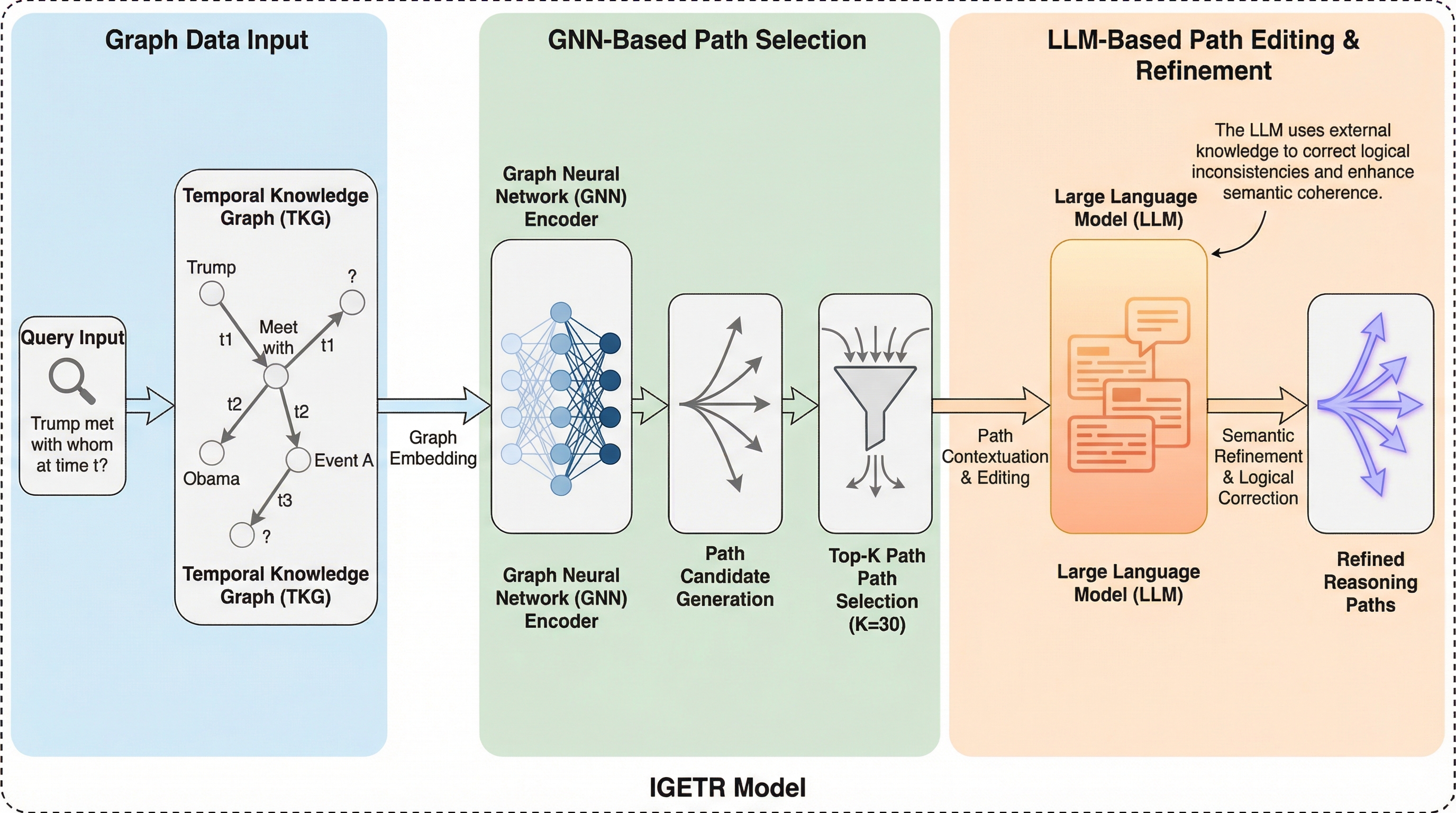 IGETRは、グラフニューラルネットワークが持つ構造的な推論能力と、大規模言語モデルが備える広範な外部知識および文脈理解を戦略的に統合した、時間的知識グラフ推論のための新しいハイブリッドフレームワークです。