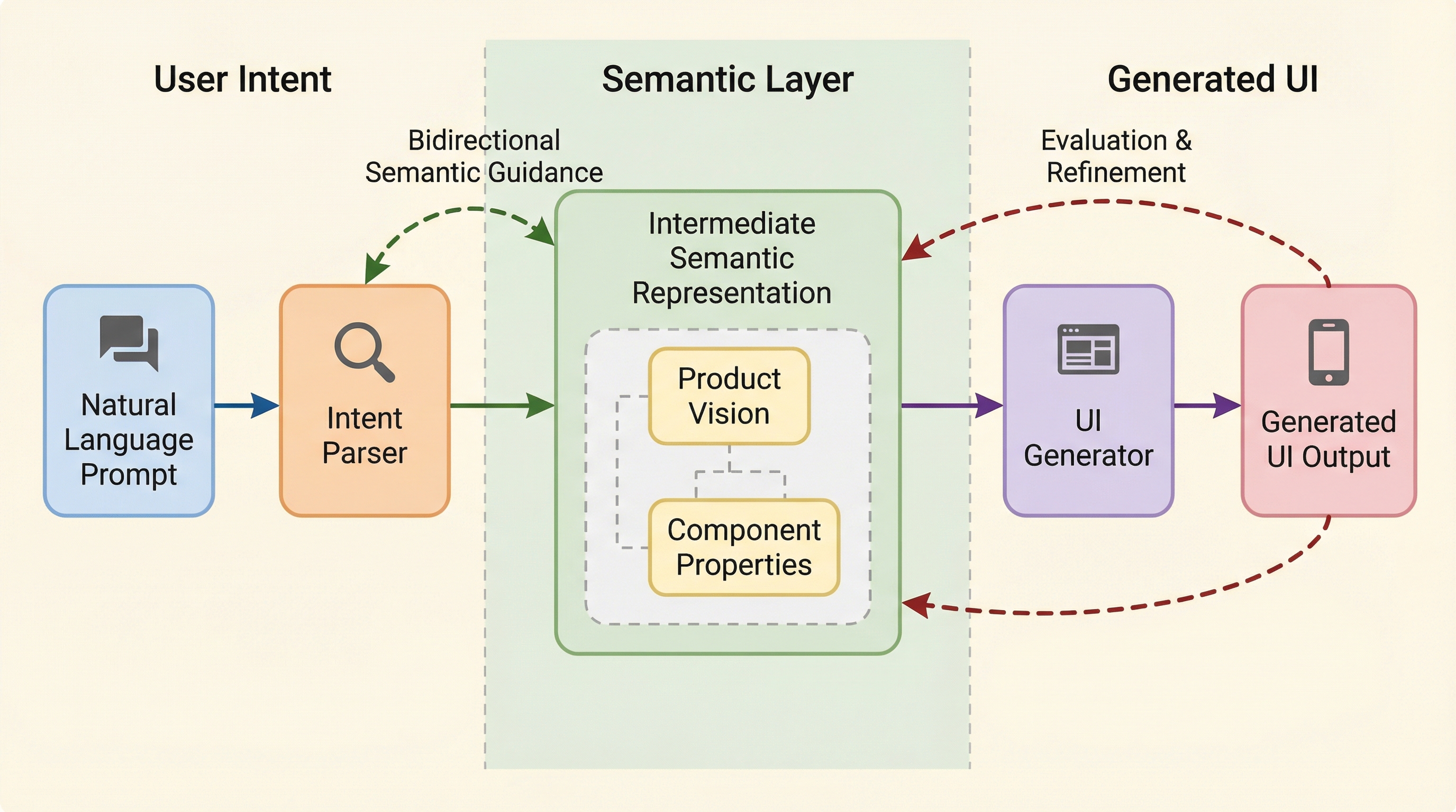 現在のテキストからUIを生成するAIシステムでは、ユーザーが自身のデザイン意図を言語化して伝えることが難しく、また生成された結果がなぜそのようになったのかを理解して修正することが困難であるという、実行と評価の両面における大きな隔たりが存在している。 本研究では、主要なUI生成サービスのガイドラインを分析することで、UIデザインに必要な意味要素が階層的で相互依存的な構造を持つことを明らかにし、人間とAIの間に明示的な意味表現を介在させることで、意図の構造化と結果の解釈を支援する新しいシステムを提案した。 ユーザー調査を通じて、この意味的ガイダンスを用いる手法は、従来のプロンプト入力と比較して、ユーザーがデザインの意図をより詳細に制御でき、生成されたUIの背後にある決定プロセスを透明化することで、より予測可能で体系的なデザインの反復と洗練を促進することが確認された。