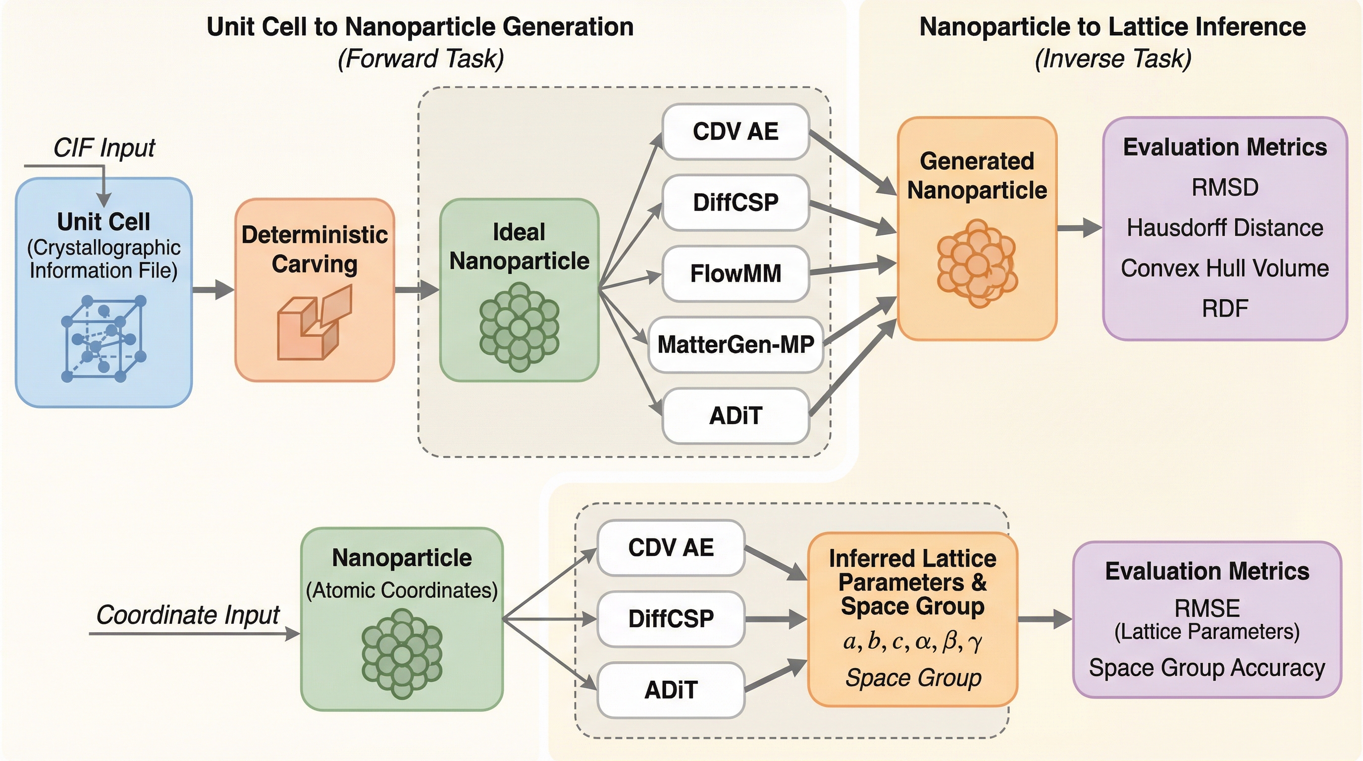 C2NPは、無限の周期性を持つバルク結晶と有限のナノ粒子の間にある構造的ギャップを埋めるための新しい評価用ベンチマークであり、17万件以上の多様なナノ粒子構成を用いて生成モデルの幾何学的な汎化性能を厳密に測定する。 結晶から粒子を生成する前方タスクと、粒子から元の格子定数や対称性を復元する逆方タスクの双方向評価を通じて、モデルが表面効果やサイズ依存の歪みを物理的に理解しているか、あるいは単に訓練データを記憶しているかを検証する。 最新の拡散モデル等を用いた実験の結果、既存手法は分布外のサイズや方向に対して脆弱であり、特に空間群と格子パラメータを同時に正しく推定する能力が著しく不足していることが判明し、物理的なスケーリング則の学習という課題を浮き彫りにした。