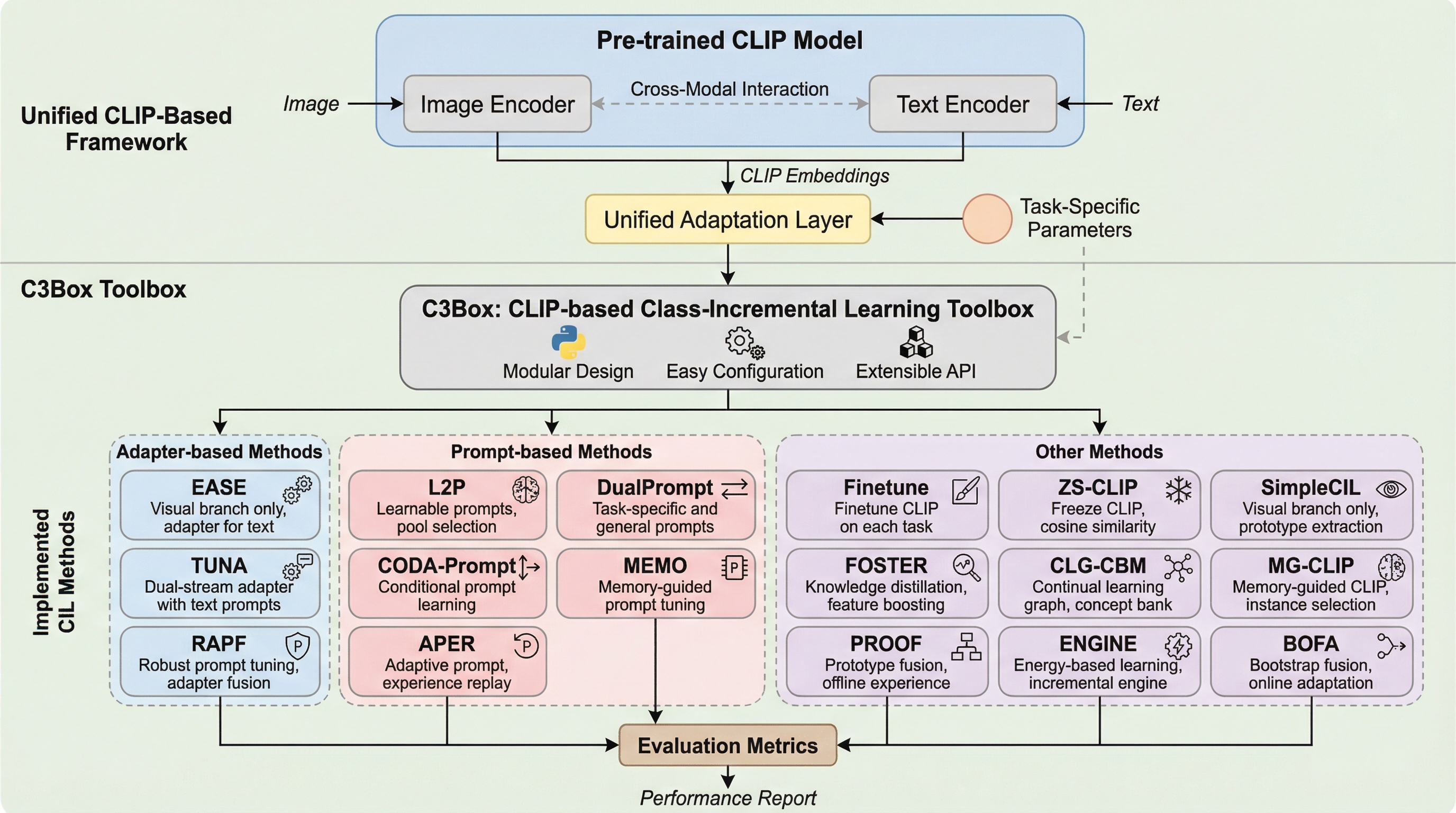 従来の深層学習は静的なデータ分布を前提としており、新しいクラスを順次学習する際に過去の知識を失う「破滅的忘却」が大きな課題となっていました。近年、CLIPのような事前学習済みモデルを活用したクラス増分学習(CIL)が注目されていますが、既存の手法は実装コードが分散しており、実験設定や評価指標が統一されていないため、公平な比較や再現が困難という問題がありました。 本研究では、CLIPを基盤としたクラス増分学習のためのモジュール化された包括的なPythonツールボックスである「C3Box」を提案し、伝統的な手法から最新のCLIP専用手法までを統合しました。C3Boxは、JSON形式の設定ファイルと標準化された実行パイプラインを採用することで、低いエンジニアリング負荷で再現性の高い実験を可能にし、研究者が新しい手法を容易に統合できる環境を提供します。 17種類の代表的な手法を10種類のベンチマークデータセットで検証した結果、CLIPベースの手法が従来のCIL手法を上回る性能を示すことが確認され、本ツールボックスが信頼性の高い評価プラットフォームであることが示されました。このツールボックスは、主要なOSをサポートし、広く普及しているオープンソースライブラリのみに依存しているため、コミュニティ全体での活用と継続的な発展が期待されます。