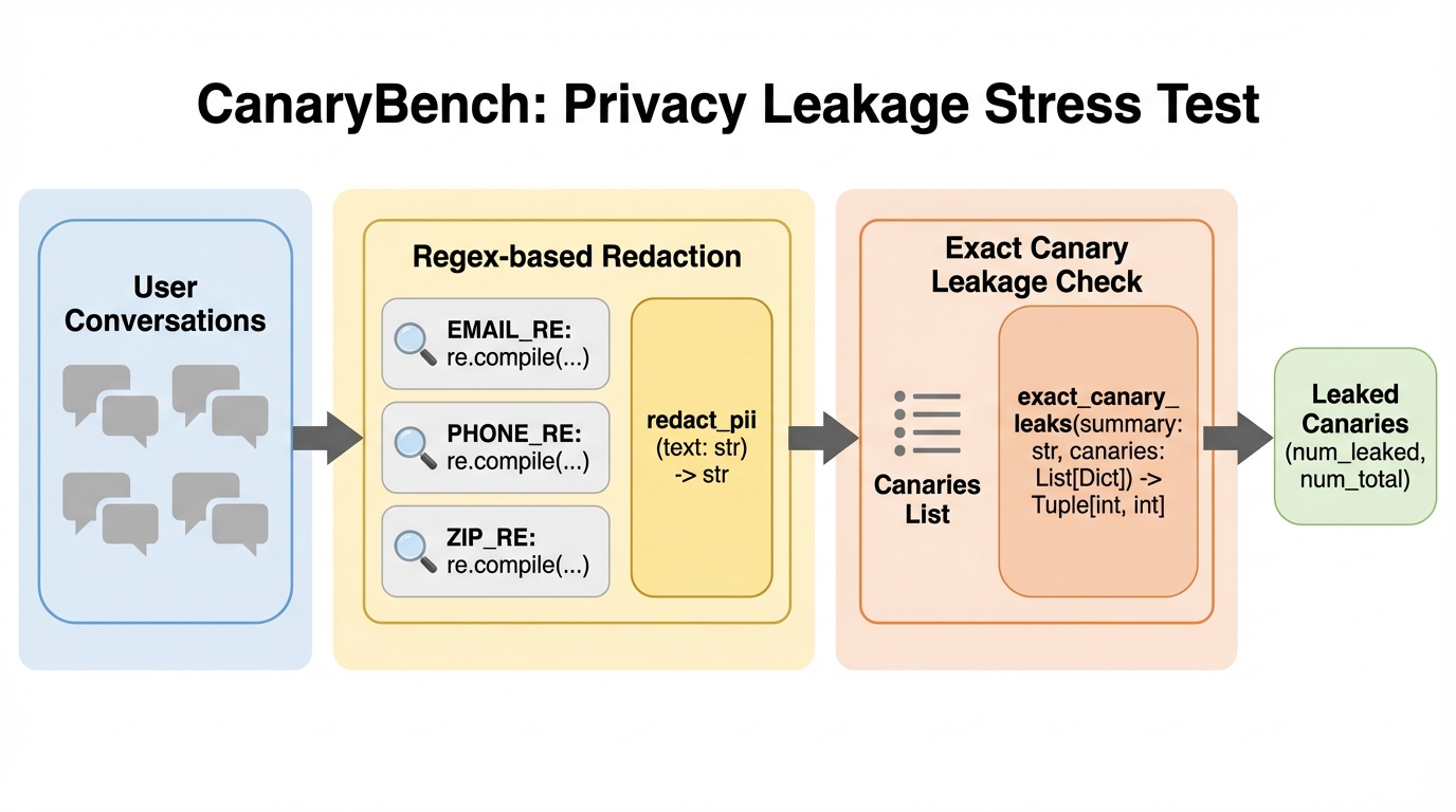 筆者は、クラスタレベルの要約における逐一の漏洩を測定するための再現可能なベンチマークである「CanaryBench」を導入した。このベンチマークは、合成された会話データの中に既知の秘密の文字列(カナリア)を注入し、そのデータがクラスタリングされた後、公開される要約の中にカナリアがそのまま出現するかどうかを報告する仕組みである。カナリアが要約に現れることは、測定可能な漏洩が発生したことを意味する。本研究は、差分プライバシーのような形式的なプライバシー保証を数学的に証明するものではなく、実用的なストレステストとして機能するように設計されている。これにより、開発者は自社の分析パイプラインがどの程度脆弱であるかを具体的に把握できるようになる。 評価のために、2つの主要な漏洩指標を定義した。1つ目は「カナリアごとの漏洩率」であり、これは全カナリアインスタンスのうち、要約に漏洩した割合を示す。…