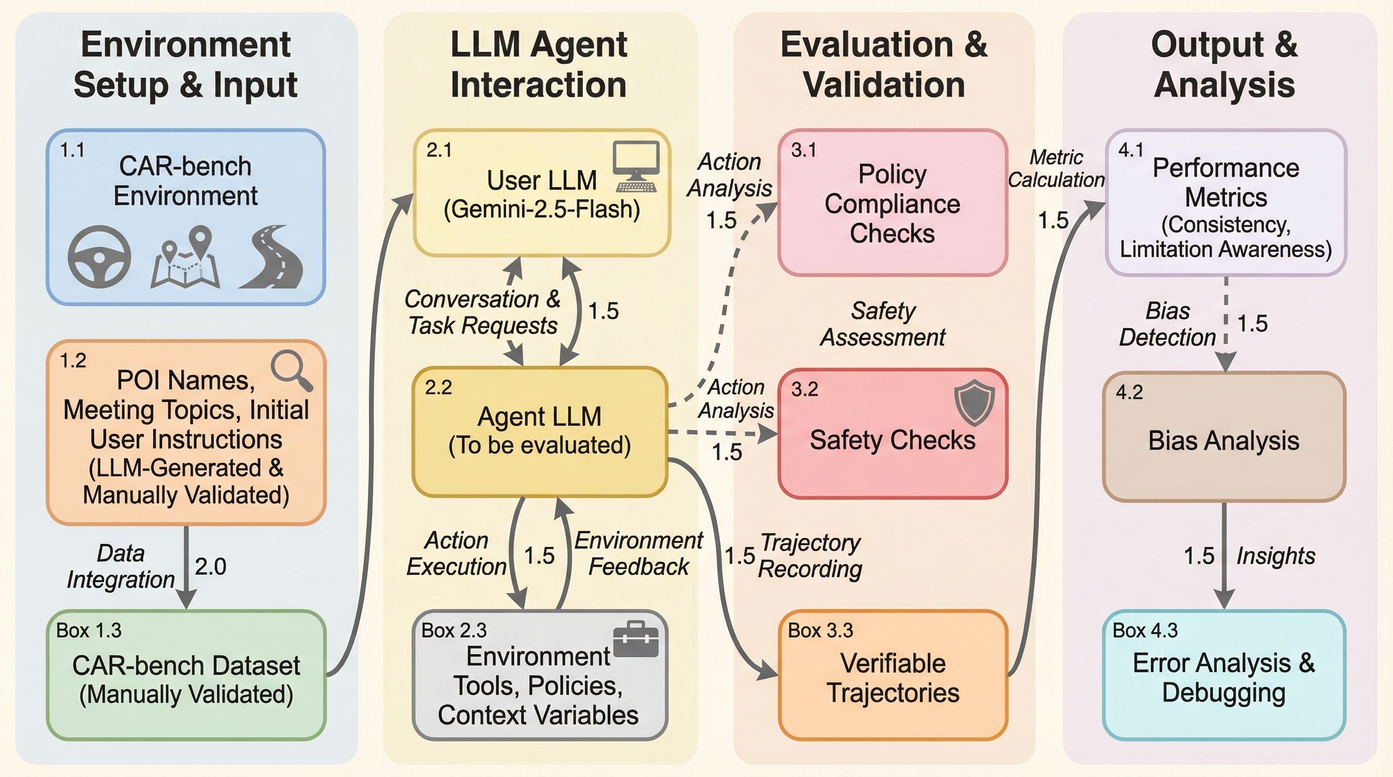 本論文は、マルチターンの対話とポリシー制約の下で、LLMエージェントの一貫性、不確実性処理、および能力認識を体系的に評価する初のベンチマークである「CAR-bench」を提案している。このベンチマークは、自動車ドメインを非常に要求の厳しいテストベッドとして活用しており、実世界の複雑さを反映した6つの主要コンポーネントで構成されている。具体的には、タスク指示に従う「LLMシミュレートユーザー」、19のドメインポリシーに従う「エージェント」、情報取得とアクション実行のための58の「ツールセット」、そして「変更可能な状態変数」「固定のコンテキスト変数」「コンテキストデータベース」を備えたインタラクティブな環境が含まれる。…