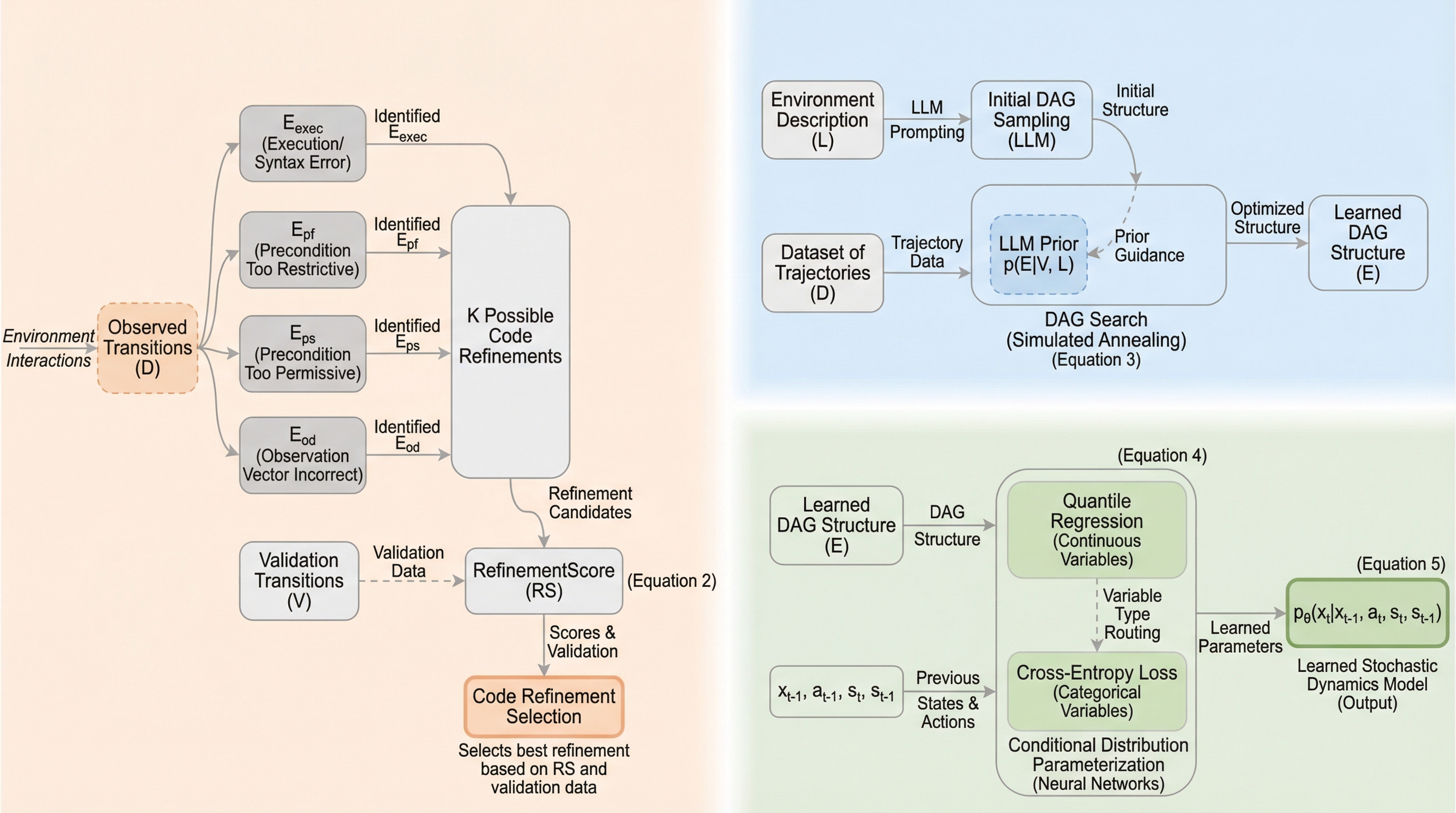 本研究では、決定論的な動態のためのシンボリックなコードコンポーネントと、確率的な不確実性のための確率的グラフィカルモデルを統合した、デュアルストリームのニューロシンボリックフレームワークである「CASSANDRA(Combining A Symbolic and Stochastic Architecture for Non-deterministic Domains)」を提案した。このフレームワークは、自然言語による環境の説明を初期知識として活用し、プログラムモデルとグラフィカル構造の両方を初期化した後、観測された軌跡データを用いてそれらを洗練させていく。 CASSANDRAは、環境を「意味的に豊かな部分観測マルコフ決定過程(SRPOMDP)」としてモデル化する。このモデルは、観測空間、状態空間、行動空間、遷移関数、報酬関数、割引率、および環境の動態を記述したテキストコーパスで構成される。…
