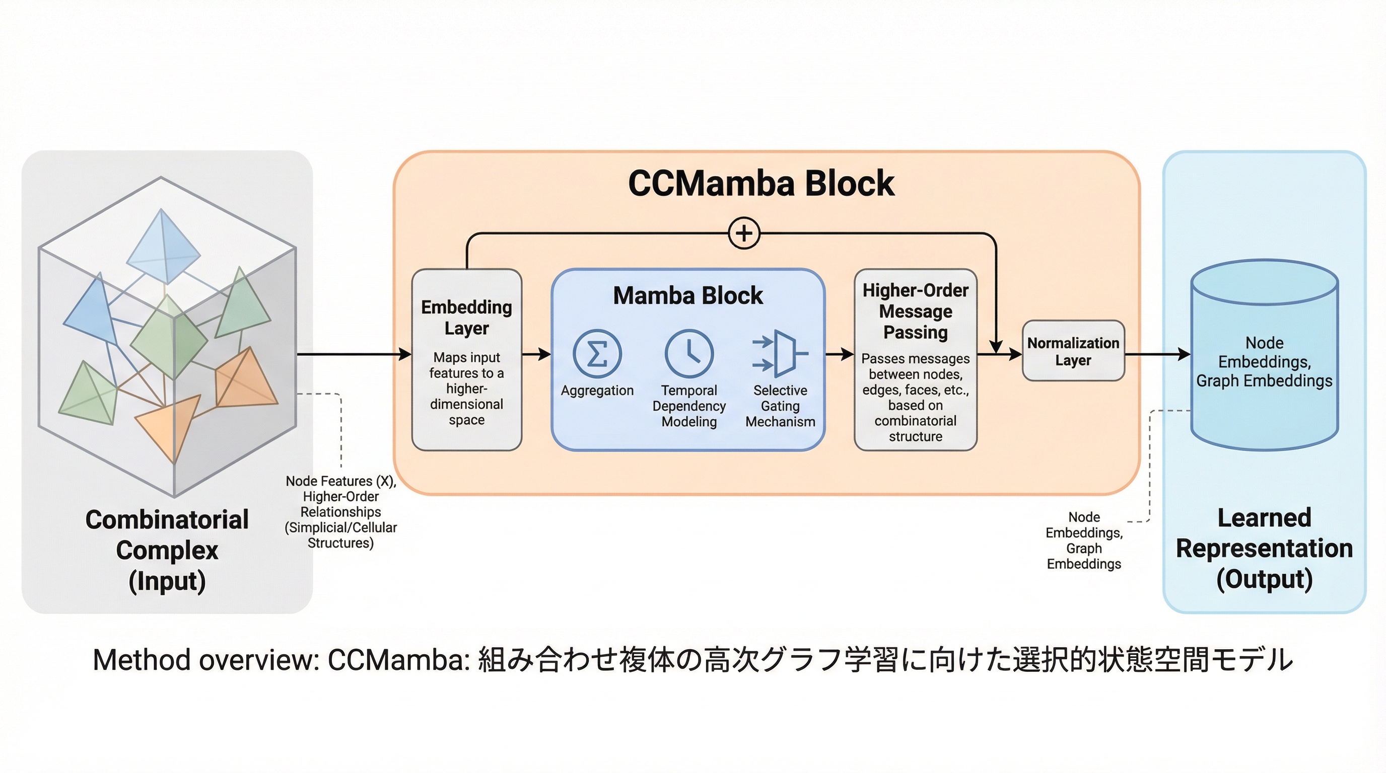 現実世界の複雑なデータ構造を扱うため、グラフやハイパーグラフを包括する「組み合わせ複体」という統一的なトポロジカル枠組みを採用し、線形時間で動作する初のMambaベースの学習モデルであるCCMambaを提案した。