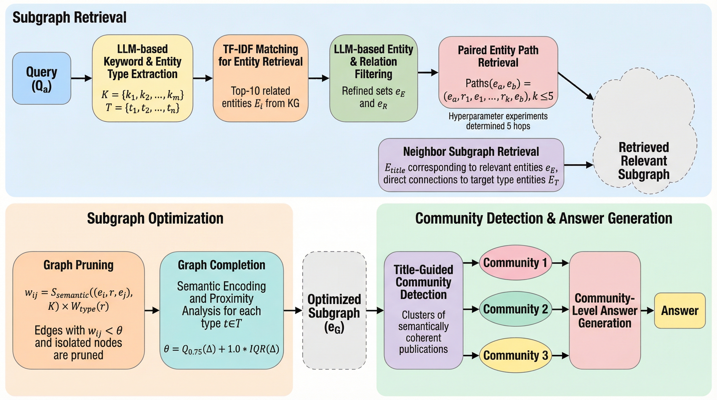 本研究では、学術知識グラフ上でのコミュニティ検出のために中心エンティティを活用するグラフ最適化手法「CE-GOCD(Central Entity-Guided Graph Optimization for Community Detection)」を提案しました。この手法の最大の特徴は、各論文の「タイトル」を中心エンティティ(Central Entity)として位置づけ、それを起点としてグラフ構造を整理・活用する点にあります。学術論文においてタイトルは、その論文に含まれるすべての構成要素(モデル、データセット、手法、課題など)を束ねるハブの役割を果たします。この特性を利用することで、論文を一つの独立した意味単位として扱いながら、他の論文や概念との関係性を構造的に捉えることが可能になります。 CE-GOCDのプロセスは大きく3つのステップで構成されています。第一に、論文タイトルを中心としたサブグラフの検索です。…