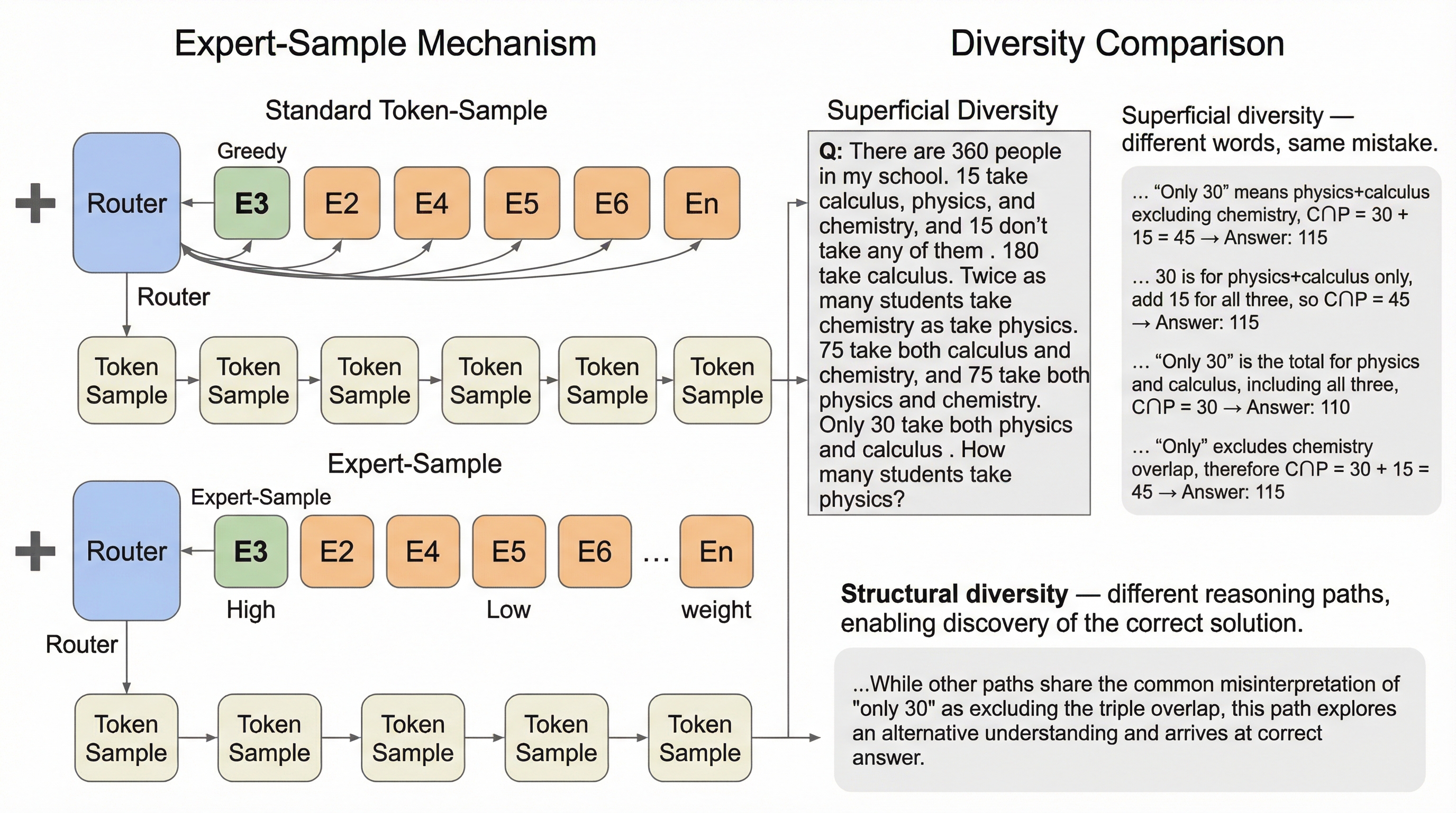 細粒度MoEのルーティングにおいて、推論の核を担う少数の高確信度エキスパート(確かなヘッド)と、多様性に寄与する多数の低確信度エキスパート(不確かなテイル)が存在することを発見しました。 この構造を利用し、ヘッドを固定して安定性を保ちつつ、テールの範囲から確率的にエキスパートを選択する手法「Expert-Sample」を提案し、追加学習なしで推論時の多様性と品質の両立を実現しました。 数学や専門知識を問う難関タスクにおいて、従来のトークン単位のサンプリングを上回る正解発見率(pass@n)と検証精度を達成し、Qwen3やDeepSeek-V2などの最新モデルでその有効性を実証しました。
