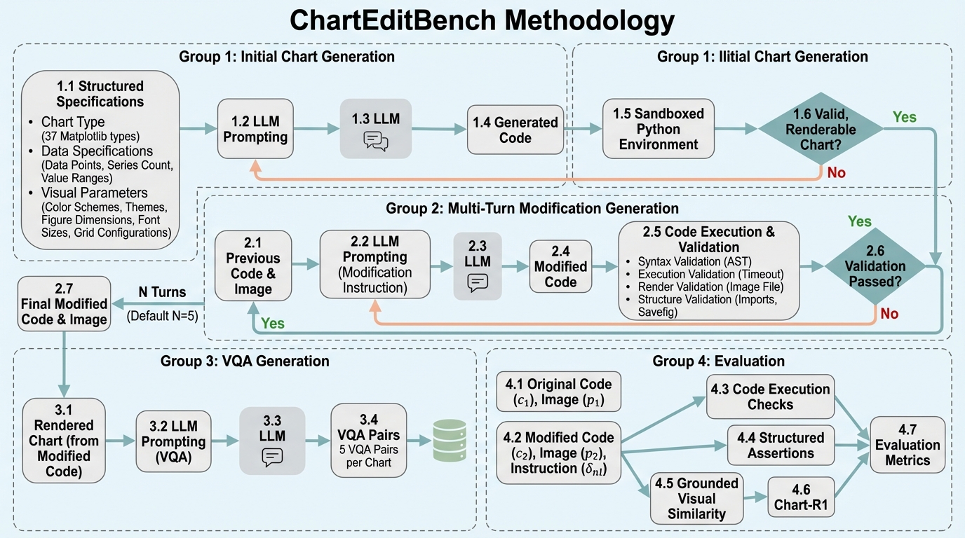 著者らの提案は、「増分のチャート編集」を、マルチモーダル言語モデルに対する明確なベンチマーク課題として定式化し、そのためのデータと評価枠組みをセットで提示することです。ベンチマークであるChartEditBenchでは、初期状態としてチャートのコードと画像の組を与え、そこから段階的な変更を経て別の状態に遷移できるかを測ります。課題設定は大きく2種類に整理されています。1つは、元のコードと元画像に加えて「変更後の目標画像」を提示し、その見た目の差分を根拠にしてコードを修正させるものです。…