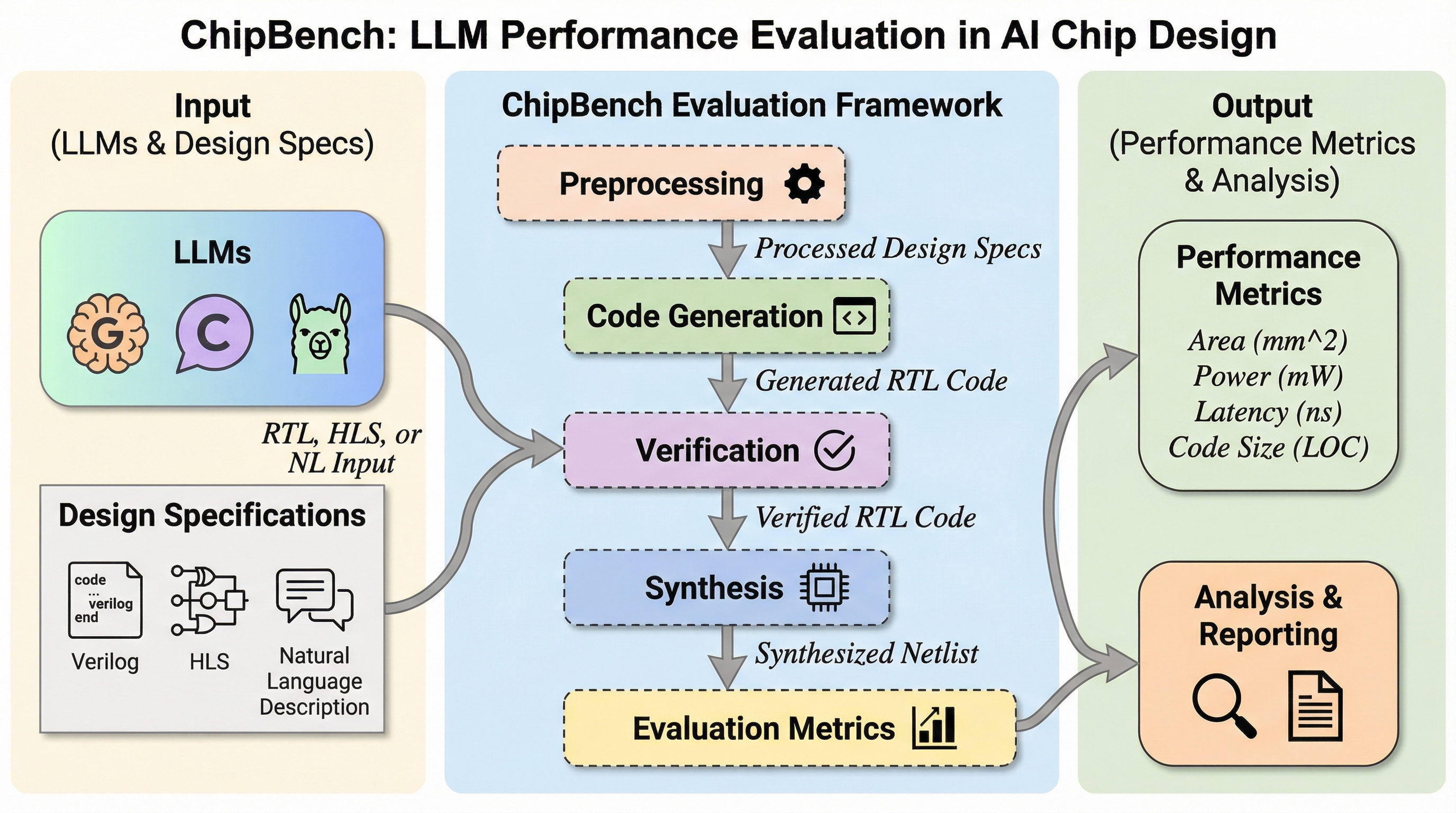 従来のVerilog評価ベンチマークが飽和し、最新のLLMが95%以上の合格率を達成する中で、産業レベルの複雑なチップ設計に対応するため、Verilog生成、デバッグ、リファレンスモデル生成の3つの重要タスクを網羅した「ChipBench」が提案されました。 本ベンチマークは、従来の3.8倍のコード長と13.