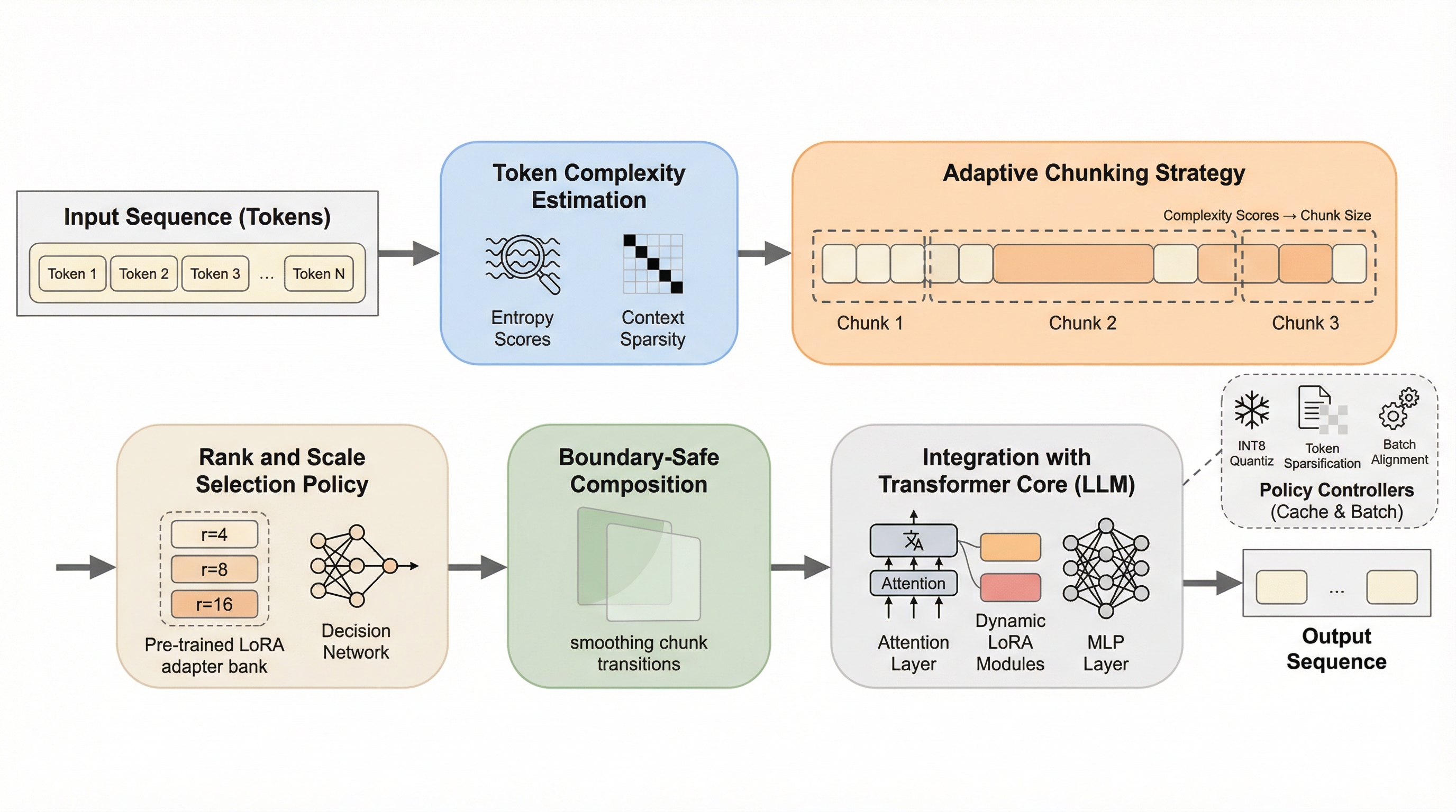 本研究では、推論時にシーケンスをトークンの複雑さに基づいて可変長のチャンクに分割し、各チャンクに対して最適なLoRAランクとスケーリングを割り当てる「ChunkWise LoRA」という動的なフレームワークを提案しました。この手法の核心は、学習済みの低ランク部分空間を再利用しながら、局所的な難易度に応じてアクティブにする次元の数を柔軟に変更する点にあります。具体的には、ランタイムスケジューラがトークンの難易度をリアルタイムで推定し、それに基づいて適応的なチャンク分割を行い、各チャンクにふさわしいランクを「ランク梯子(rank-ladder)」メカニズムから選択します。…