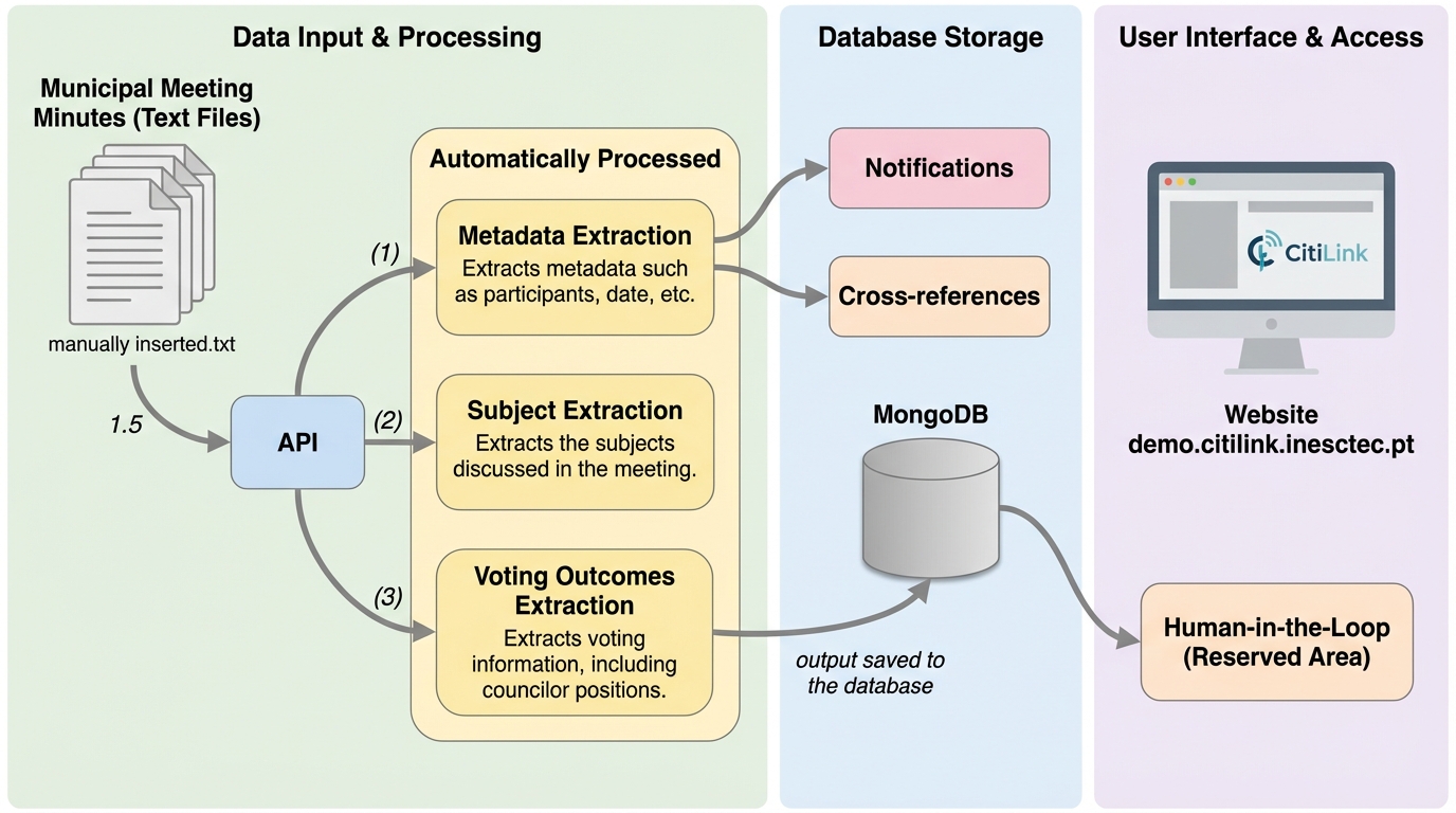 地方自治体が公開する議事録は、官僚的で難解な記述スタイルや膨大な文書量により、市民やジャーナリストが特定の情報を効率的に検索することが困難であるという課題を抱えている。本研究では、大規模言語モデル(LLM)であるGemini 2.0 Flashを活用し、非構造化データである議事録からメタデータ、議論の主題、投票結果を自動抽出して構造化するプラットフォーム「CitiLink」を開発した。ポルトガルの6つの自治体から提供された120件の議事録を用いた検証の結果、メタデータ抽出で0.84という高いF1スコアを記録し、自治体職員によるユーザビリティテストでも直感的な操作性が高く評価されるなど、行政の透明性と市民参加を促進する有効なツールであることが実証された。