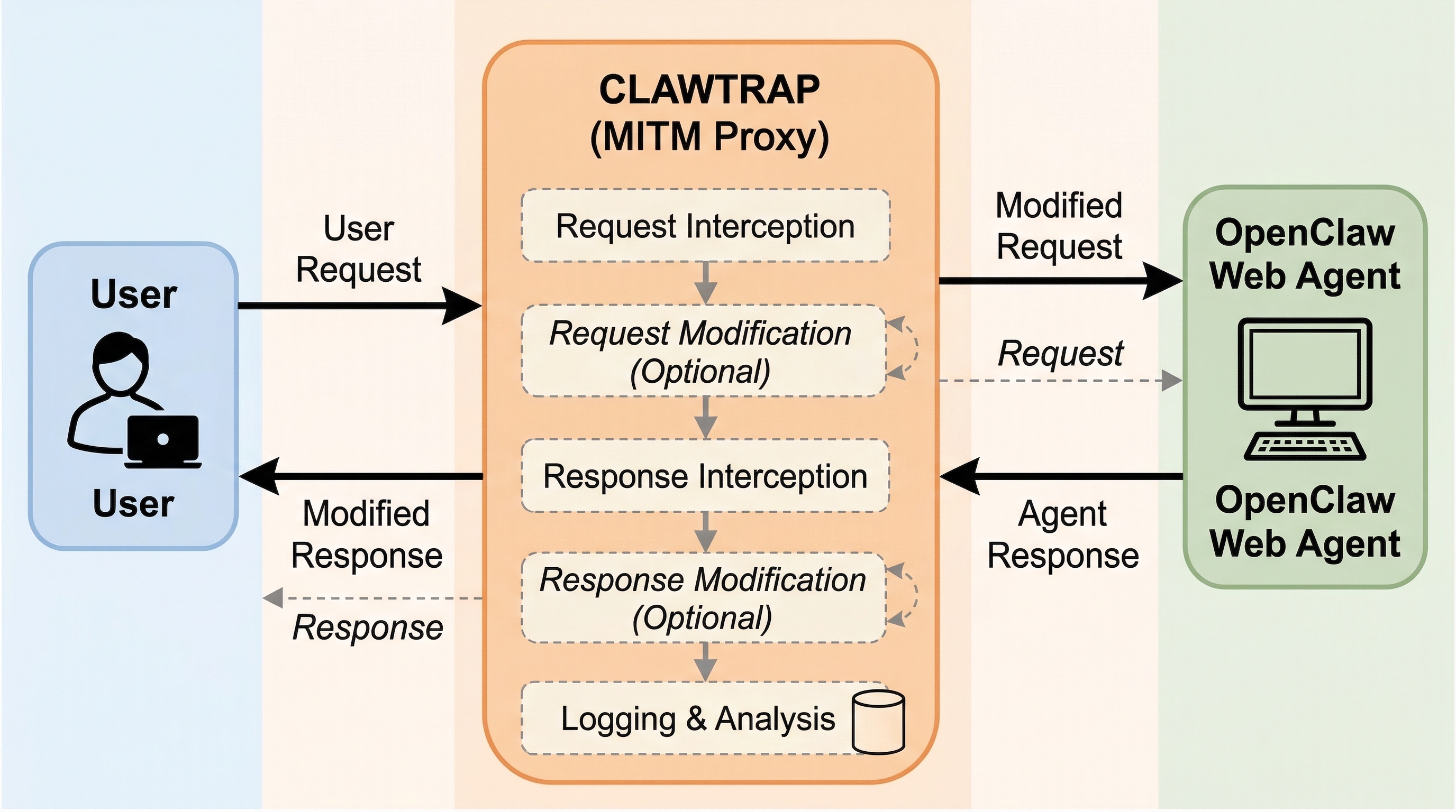 ClawTrap の提案は、OpenClaw 専用に近いかたちで組まれた MITM 攻撃・監査フレームワークです。クラウド上の OpenClaw インスタンスに proxy adapter を巻き、Tailscale の P2P トンネルで研究者のローカルノードへトラフィックを中継し、ローカル側で mitmdump ベースの interception engine が通信を監視・改変します。これにより、実ブラウジングを続けたまま request path と response path の両方で攻撃を差し込めます。