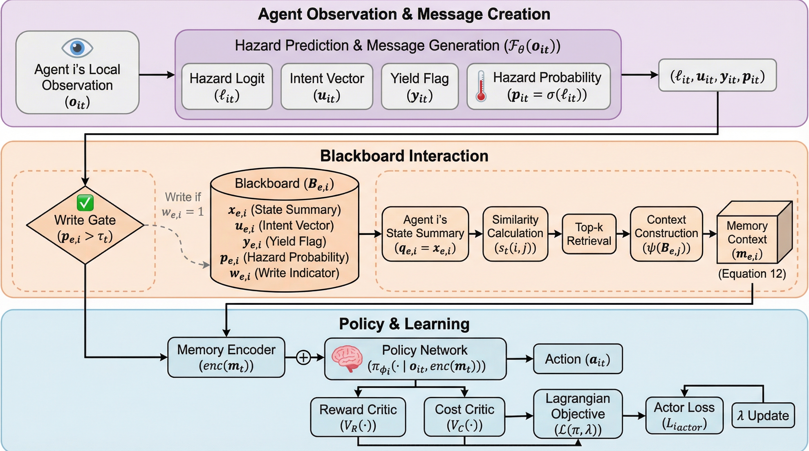 制約付きマルチエージェント強化学習(MARL)の分野では、集団全体の報酬を最大化することと、個々のエージェントが安全制約を厳格に守ることの間に、解消しがたい緊張関係が存在している。協力的なタスクにおいて、エージェントが未知の環境を積極的に探索しようとすると、どうしてもコストのかかる制約違反を招きやすくなる。一方で、違反を恐れて過度に保守的な更新を行うと、学習が早期に停滞してしまい、エージェントが本来達成可能な高い性能を持つ共同行動を発見することが妨げられてしまう。既存の主要なアプローチであるラグランジュ法などは、違反が発生した後に反応するグローバルな罰則や中央集権的なクリティックに依存していることが多く、これが探索を抑制し、結果として過度な保守性を引き起こす大きな原因となっている。 さらに、この問題は部分観測性や、エージェント間の相互作用によって駆動される動的な環境において、より一層複雑化する。エージェントたちが同じ報酬目標を共有している場合であっても、安全性の失敗は必ずしも個々のインセンティブの衝突から生じるわけではない。…