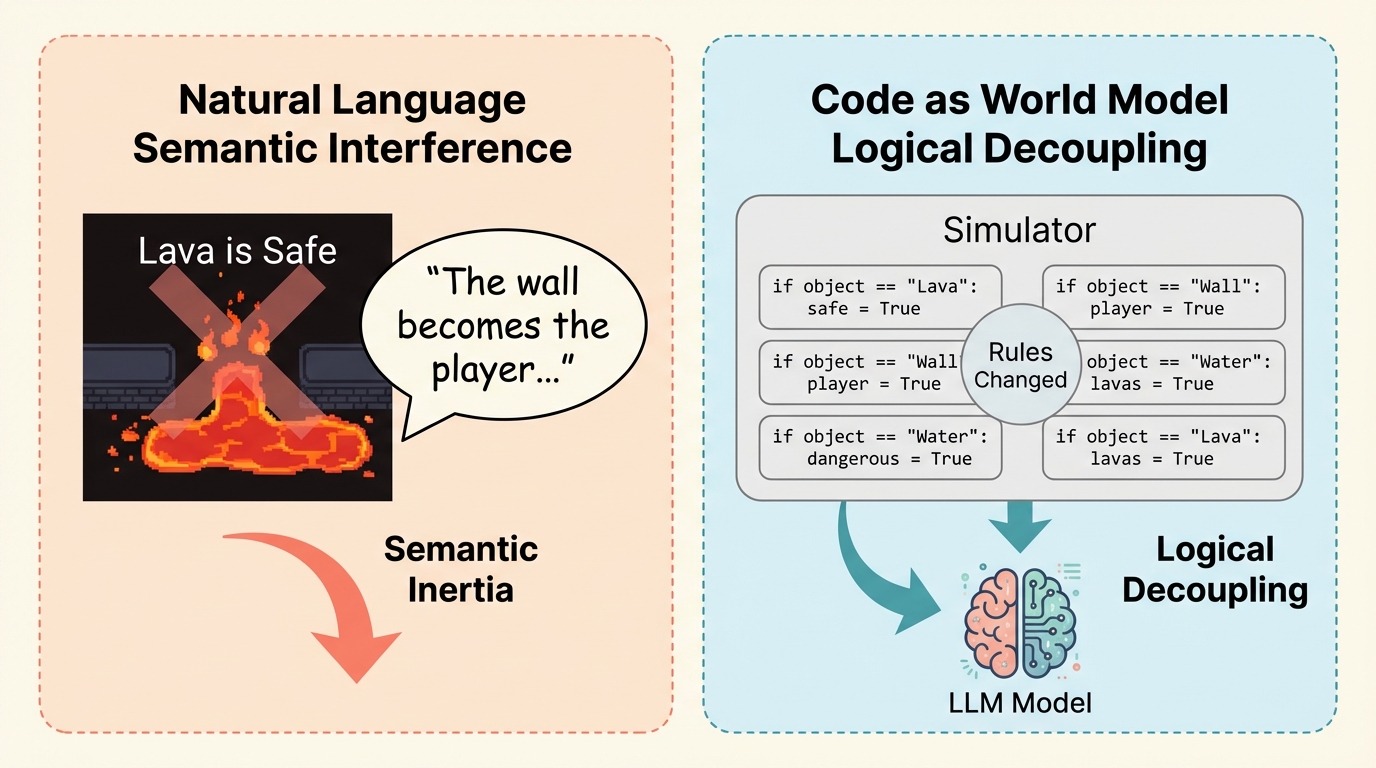 本論文では、意味的慣性を克服するための新しいアプローチとして「Code-Grounded Vistas(LCV)」を提案しています。これは、LLMの役割を「受動的な文章生成器」から「能動的な理論構築者」へと転換させるものです。具体的には、モデルに直接アクションを予測させるのではなく、現在の環境を支配している「物理法則」を表現する実行可能なPythonプログラムを合成させる手法をとります。LCVの核心は、推論の基盤を曖昧な自然言語から、厳密な論理構造を持つ実行可能なコードへと移すことにあります。自然言語による推論では、記述的な意味と論理的なルールが絡み合っており、モデルは「壁」という言葉から「通行不能な障害物」という統計的なパターンを自動的に想起してしまいます。…