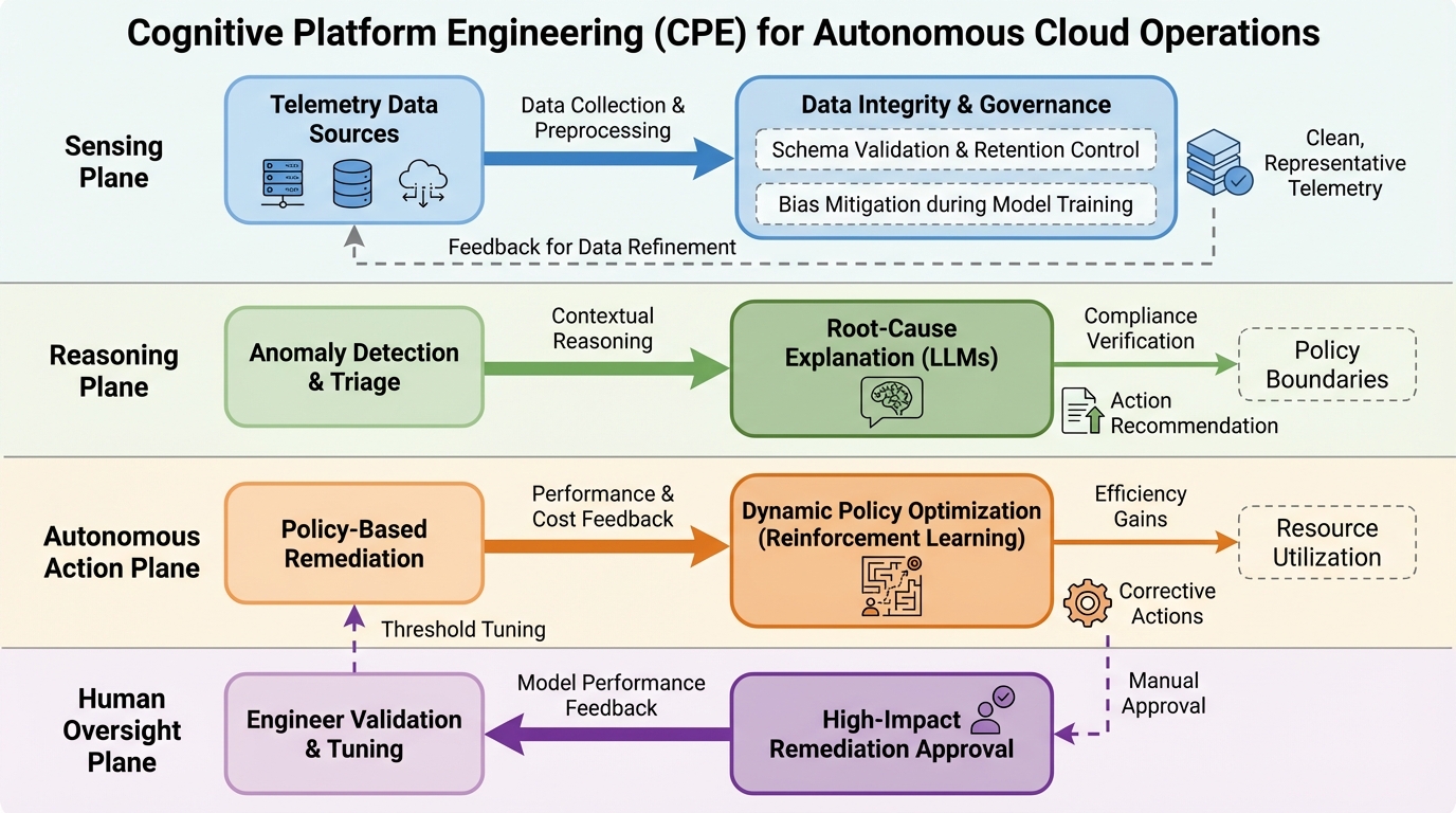 現代の複雑なクラウドネイティブ環境において、従来のDevOpsによる静的な自動化の限界を打破するため、感知・推論・行動を統合した「コグニティブ・プラットフォーム・エンジニアリング(CPE)」が提案されました。 データ、インテリジェンス、制御、エクスペリエンスの4つの層からなるリファレンスアーキテクチャを構築し、機械学習とポリシー駆動型オーケストレーションを組み合わせることで、システムの自律的な自己調整を実現しています。 プロトタイプによる検証では、平均修復時間(MTTR)を31.7%短縮し、リソース効率を18.2%向上させ、ポリシー違反を92.9%減少させるという、運用の信頼性と効率性の劇的な改善が実証されました。