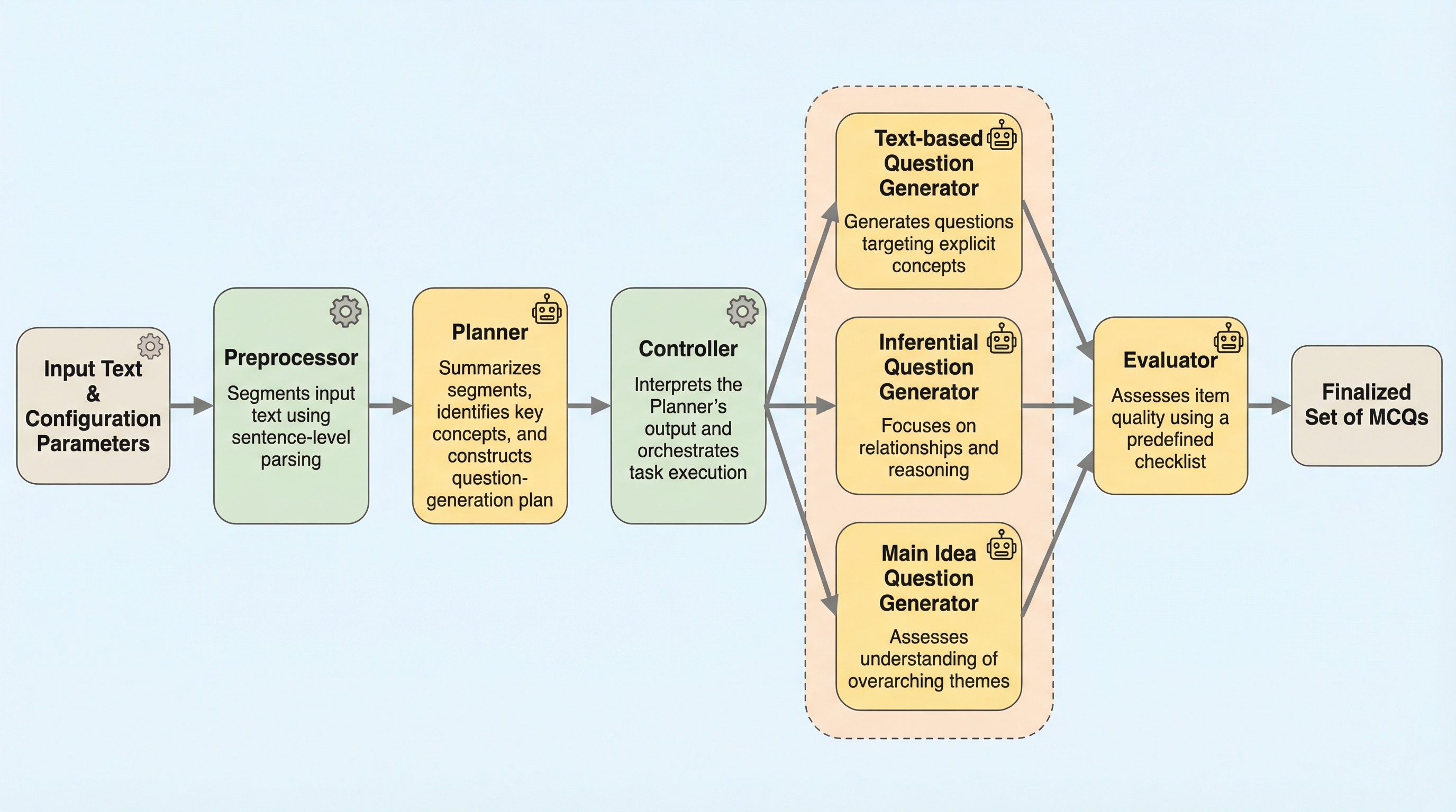 ReQUESTAは、大規模言語モデル(LLM)とルールベースの仕組みを組み合わせたハイブリッドなマルチエージェントフレームワークであり、テキスト想起、推論、主旨把握という異なる認知レベルの多肢選択式問題を系統的に生成します。