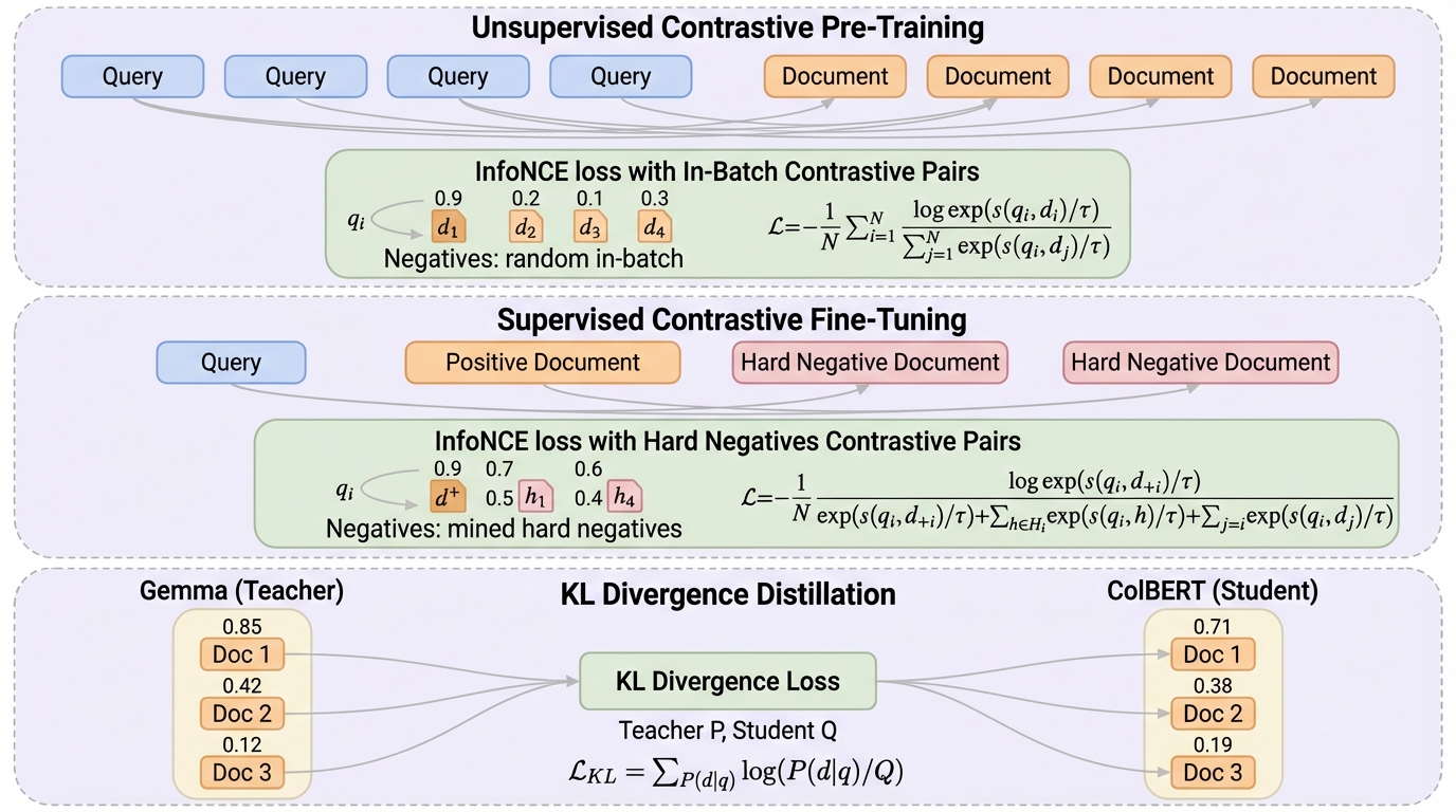 本研究の核心は、ColBERT系マルチベクトル検索モデルの学習を「段階の組み合わせ」として分解し、どの段階をマルチベクトル設定で実施することが重要かを同条件で検証することです。具体的には、(a)KDのみ、(b)教師ありコントラスト+KD、(c)教師なし・教師あり・KDのすべてをマルチベクトルで実施、という3つのパイプラインを比較します。(c)が「完全にColBERTとして事前学習されたモデル」に相当し、ColBERT-Zeroとして提示されています。 比較の要点は、同じ元モデルと同じデータを使い、違いが「コントラスト学習をdenseで行うか、late interaction(マルチベクトル)で行うか」にできるだけ集約されるようにする点です。…