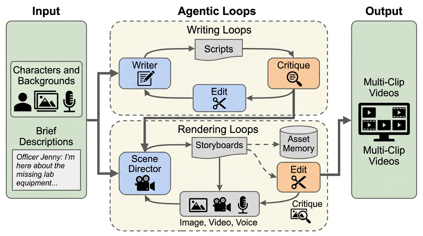 COMIC は、キャラクター画像・音声・短い説明から、サタデー・ナイト・ライブ風の短いスケッチコメディ動画を全自動で作るエージェント型動画生成システムです。 企画、脚本、批評、編集、演出、レンダリング批評を複数エージェントに分け、しかも YouTube 上の視聴者エンゲージメントに合わせて批評家を選抜することで、「人が笑うか」に寄せた反復改善ループを作っています。 実験では agentic baseline や生の frontier video model を上回り、プロ制作スケッチに近い品質まで迫ったとされ、ユーモアのような主観タスクでも批評家の設計が性能を大きく左右することを示しました。