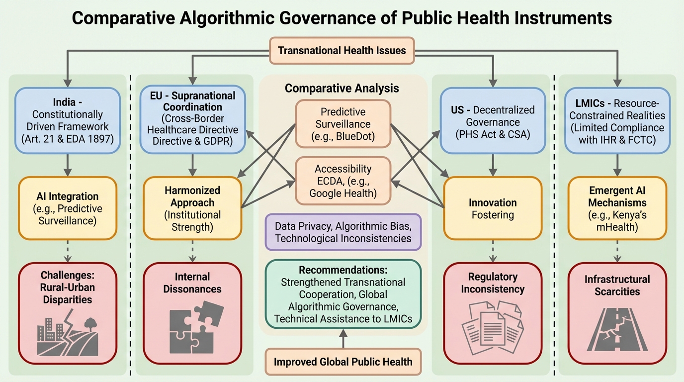 本研究は、人工知能(AI)が国際保健規則(IHR 2005)やWHOタバコ規制枠組条約(FCTC)の実施をいかに強化するかを、インド、EU、米国、および低中所得国(LMICs)の比較を通じて分析したものである。 高能力な法域ではAIが早期発見や監視の精度を向上させている一方で、低中所得国ではインフラの欠如、データプライバシーの空白、法整備の断片化といった深刻なボトルネックが、国際規範への遵守を妨げていることが明らかになった。 権利準拠で超国家的に調整された規制枠組みの中にAIを組み込むことを提唱し、WTOの紛争解決機関をモデルとしたWHO主導の遵守メカニズムや、FCTCを参考にした「グローバル・アルゴリズム条約」の策定モデルの構築を提案している。