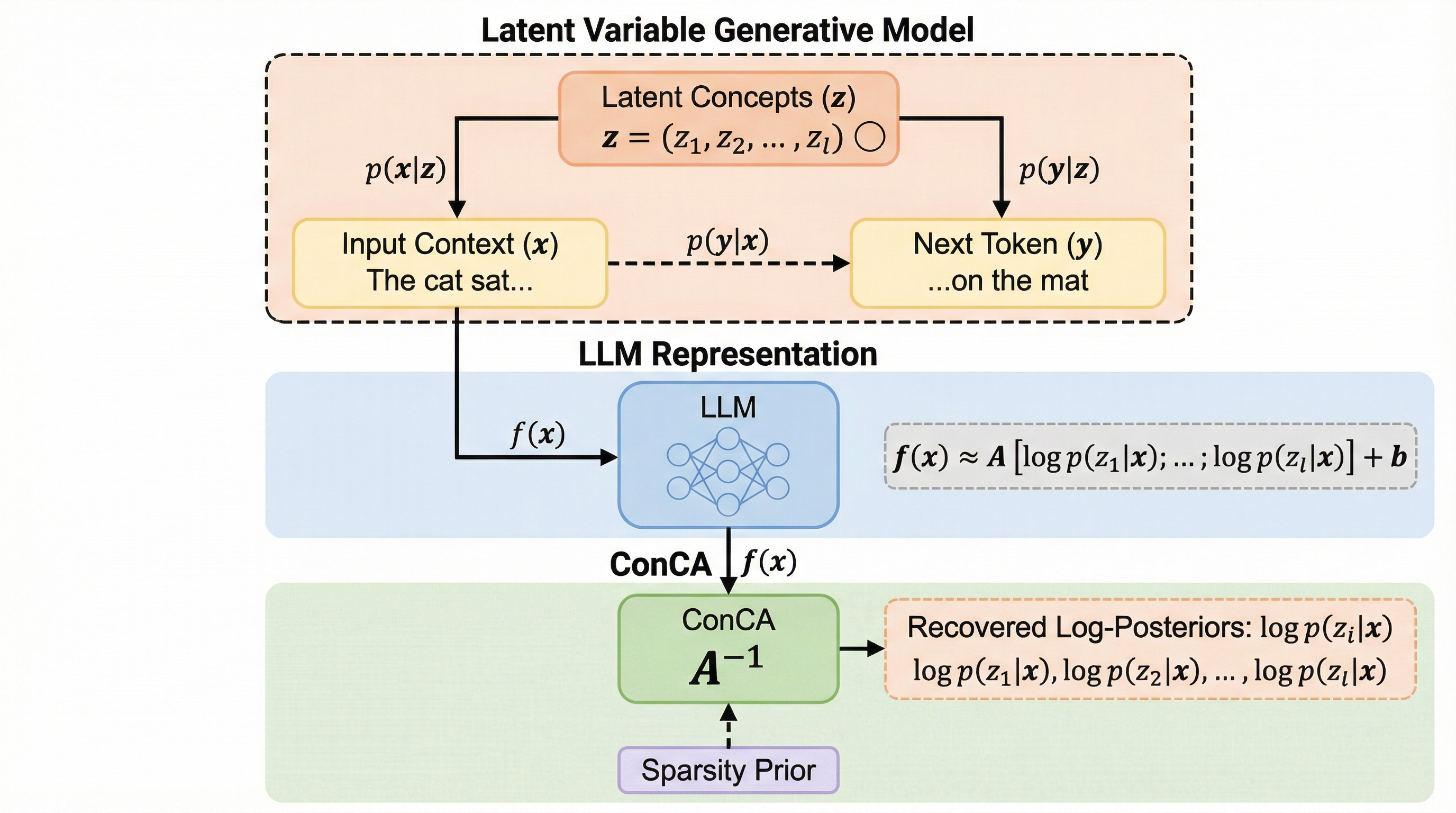 本研究では、LLMの内部表現と人間が理解可能な概念との間の理論的な関係を解明し、それに基づいた原理的な概念抽出手法である「概念成分分析(ConCA)」を提案しています。まず、テキストデータが未知の潜在的な概念によって生成されるという潜在変数モデル(LVM)を構築しました。ここで「概念」とは、時制、複数形、感情、構文的役割、トピックなど、人間が解釈可能な離散的な潜在変数として定義されます。このモデルに基づき、次単語予測の枠組みで学習されたLLMの表現が、入力文脈が与えられたときの各潜在概念の対数事後確率の線形混合として近似できることを数学的に証明しました。…