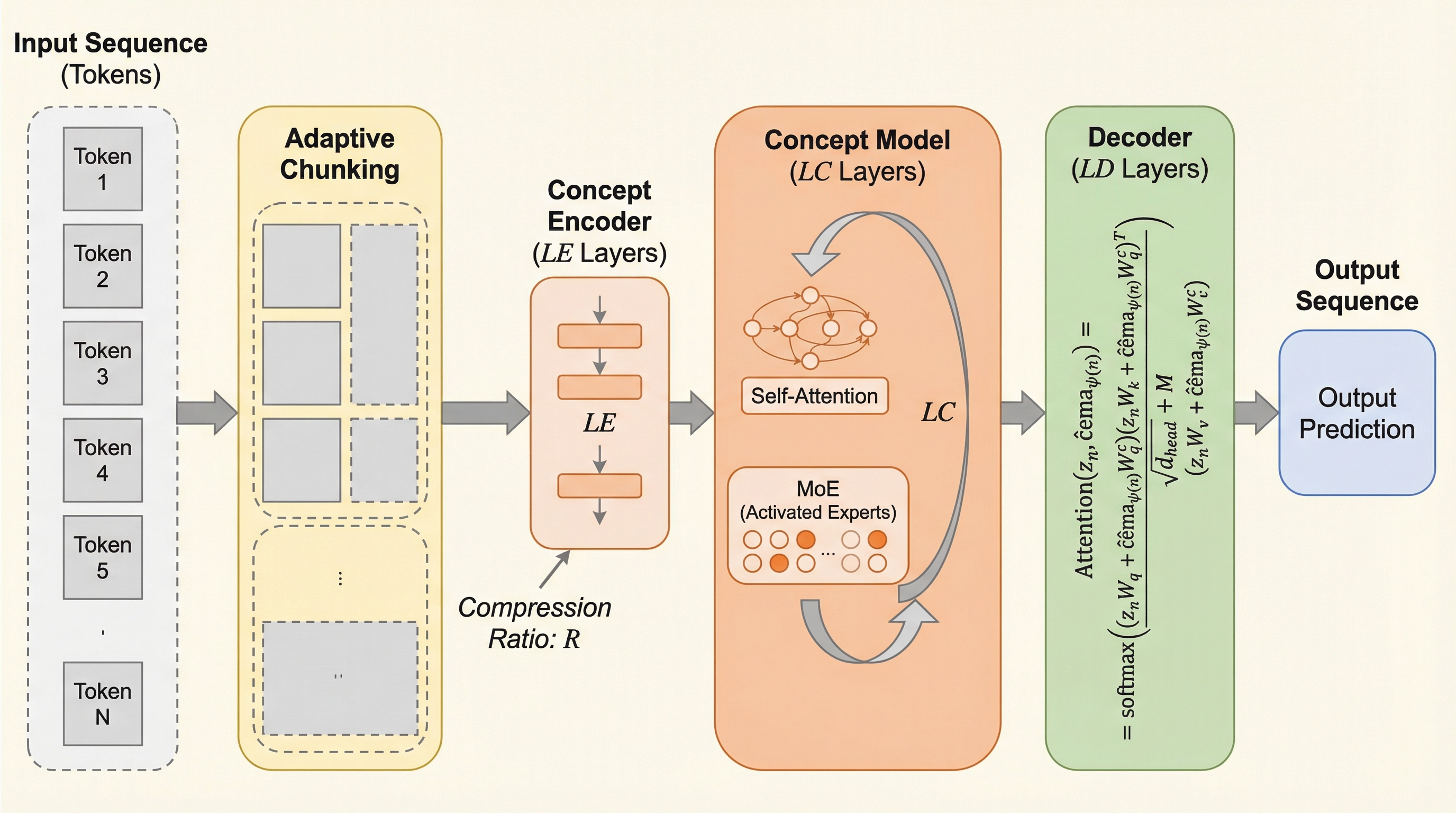 本研究が提案する「ConceptMoE」は、学習可能な適応的チャンキングを通じて、LLMの処理をトークンレベルからコンセプトレベルへと進化させるアーキテクチャである。その核心となる洞察は、意味的類似性が高い連続するトークンを統一されたコンセプト表現に統合し、意味的に異なるトークンはきめ細かな粒度を維持するというものである。これにより、予測可能なトークンシーケンスは効率的に統合処理され、複雑なトークンは詳細な計算を維持するという、暗黙的なトークンレベルの計算割り当てが自然に行われる。 ConceptMoEの重要な特徴は、混合専門家(MoE)アーキテクチャを活用することで、厳密に制御された評価を可能にした点にある。…