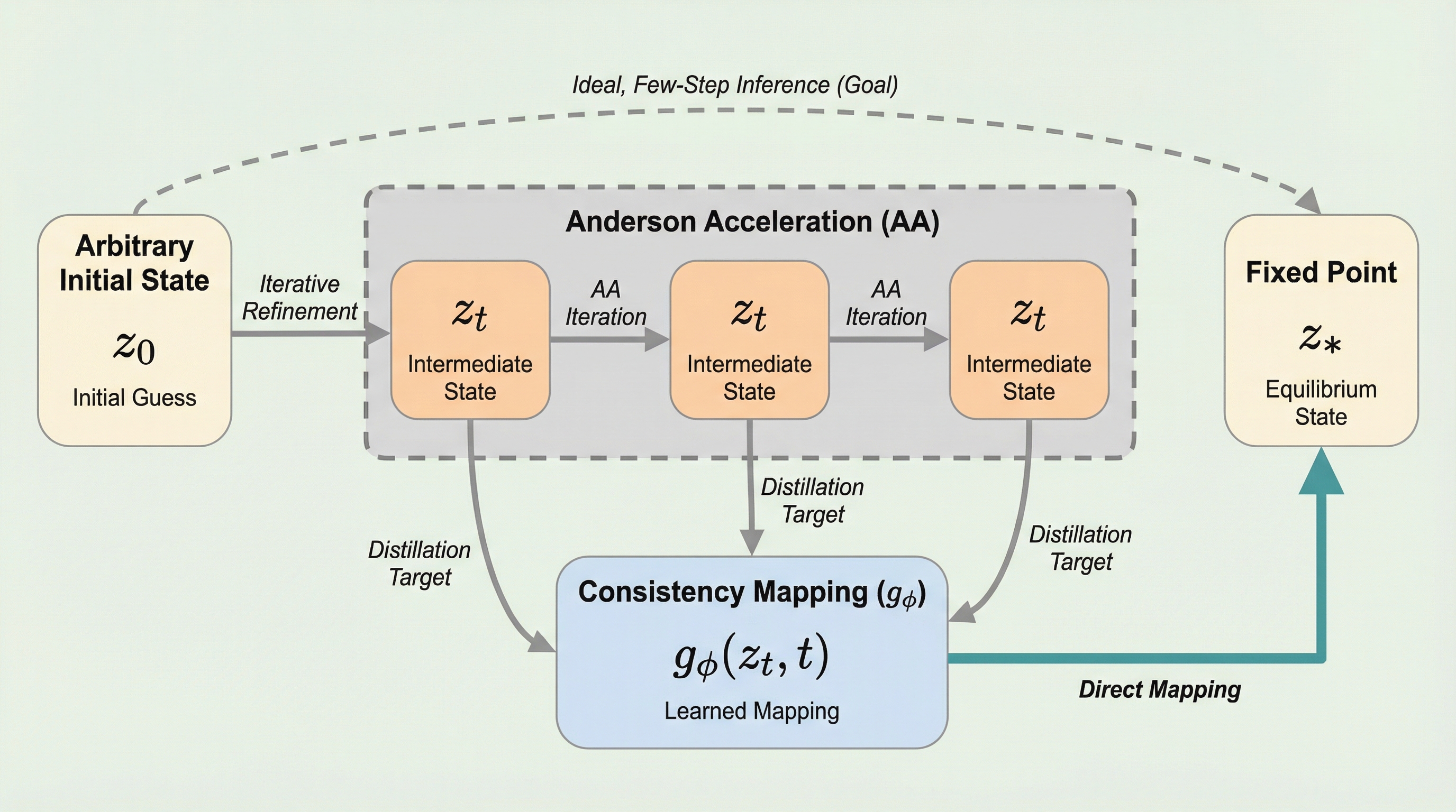 深層学習における従来のネットワーク構造は、層を積み重ねることで深さを表現する明示的な設計が主流でしたが、深層平衡モデル(DEQ)はこの概念を根本から変えるパラダイムとして登場しました。DEQは、各層を個別に定義するのではなく、入力と隠れ状態の関係を不動点方程式として定義し、その平衡状態を直接解くことで無限の深さをシミュレートします。このアプローチの最大の利点は、学習時のメモリ消費量がモデルの深さに依存せず一定であるという点にあり、画像認識や自然言語処理、グラフ学習などの多様な分野で高い表現力を示してきました。しかし、理論的な優雅さや高い性能とは裏腹に、実用化における最大の障壁となっているのが推論時のレイテンシです。平衡状態に到達するためには、アンダーソン加速やブロイデン法といった反復的な数値解法を用いる必要があり、一回の推論で数十回のネットワーク評価を繰り返さなければなりません。 これまでの研究では、初期値の推定を工夫する手法や学習可能なソルバーを導入する試みが行われてきましたが、依然として局所的なステップごとの更新に留まっており、明示的な有限層ネットワークと比較して推論速度が著しく遅いという問題が解決されていませんでした。…
