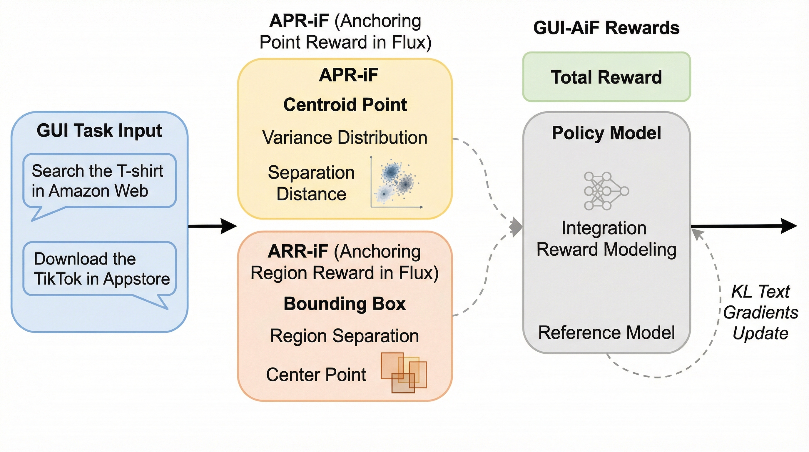 本研究では、変化し続けるデジタル環境においてGUIエージェントが継続的に学習を行うための新しいタスク「Continual GUI Agents」を定義しました。このタスクでは、異なるUIドメイン間での学習(ドメインの流動性)と、異なる解像度下での学習(解像度の流動性)という2つの主要なシナリオを設定しています。そして、この課題を解決するために、流動的な環境下でのアンカリングを実現する新しい強化学習フレームワーク「GUI-AiF(GUI-Anchoring in Flux)」を提案しました。 GUI-AiFの最大の特徴は、エージェントが特定の静的なタスクの座標やスケールに過剰適合することを防ぎ、未知の環境への適応力を高めるための2つの新しい報酬メカニズムを導入した点にあります。一つ目は「流動的アンカリングポイント報酬(APR-iF)」であり、これは予測される相互作用点の多様性を促すことで、特定の座標への偏りを軽減します。…