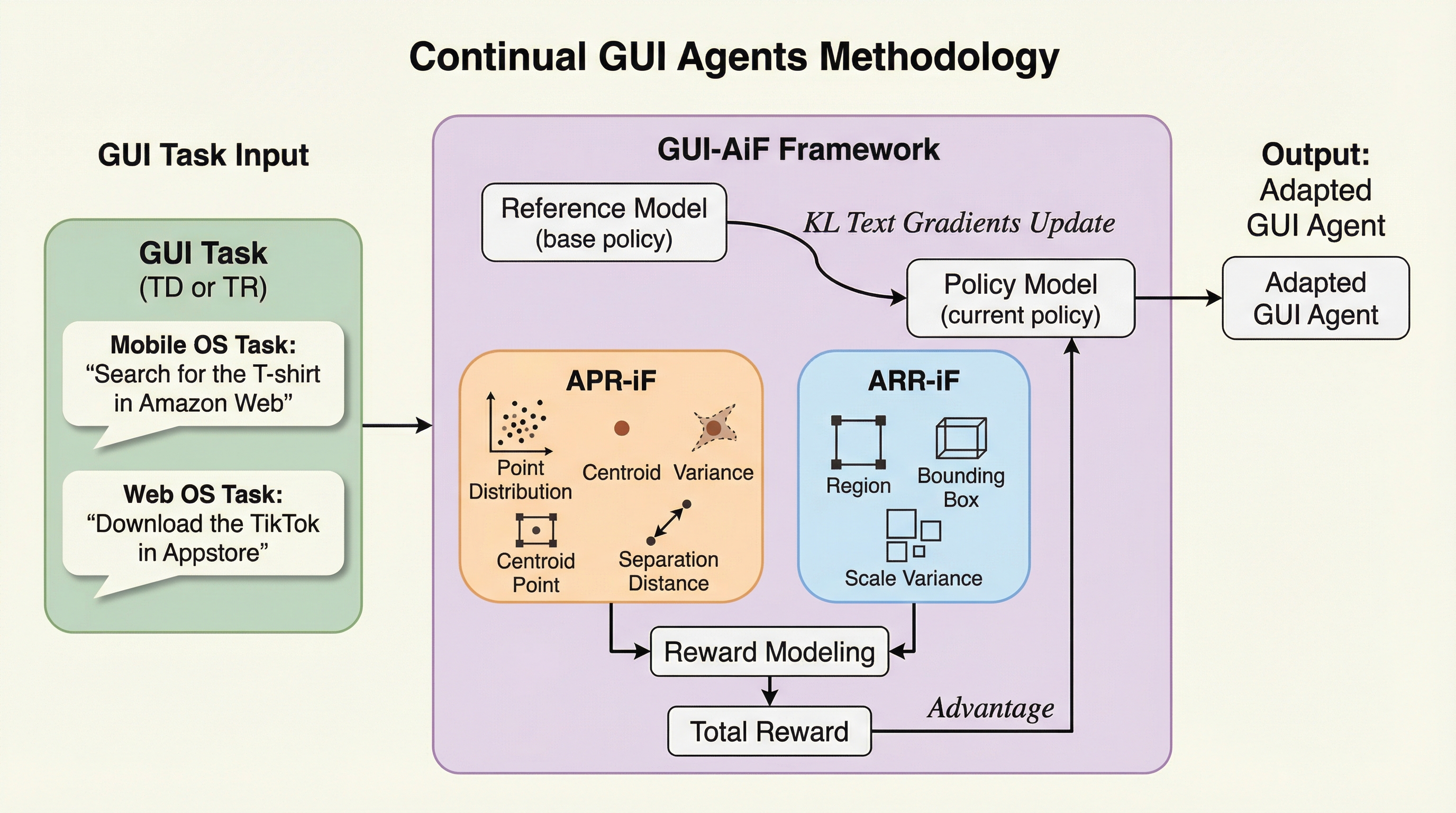 現代のデジタル環境は、OSの更新やデバイスの多様化、解像度の変化によって常にデータの分布が変動する「流動的(Flux)」な状態にあり、固定されたデータセットで学習した従来のGUIエージェントでは、未知のドメインや高解像度環境において性能が著しく低下するという課題がある。 本研究では、変化し続ける環境下でエージェントが継続的に学習を行う「Continual GUI Agents」という新しいタスクを定義し、相互作用点と領域の多様性を促す独自の報酬設計(APR-iFおよびARR-iF)を備えた強化学習フレームワーク「GUI-AiF」を提案することで、過去の知識を保持しつつ新環境へ適応する手法を確立した。 検証の結果、提案手法はScreenSpot-V1、V2、およびProの各ベンチマークにおいて、従来の教師あり微調整や既存の強化学習手法を上回る性能を達成し、モバイルからデスクトップ、ウェブへのドメイン移行や、1080pから4Kへの解像度変化に伴う性能劣化を効果的に抑制できることが示された。