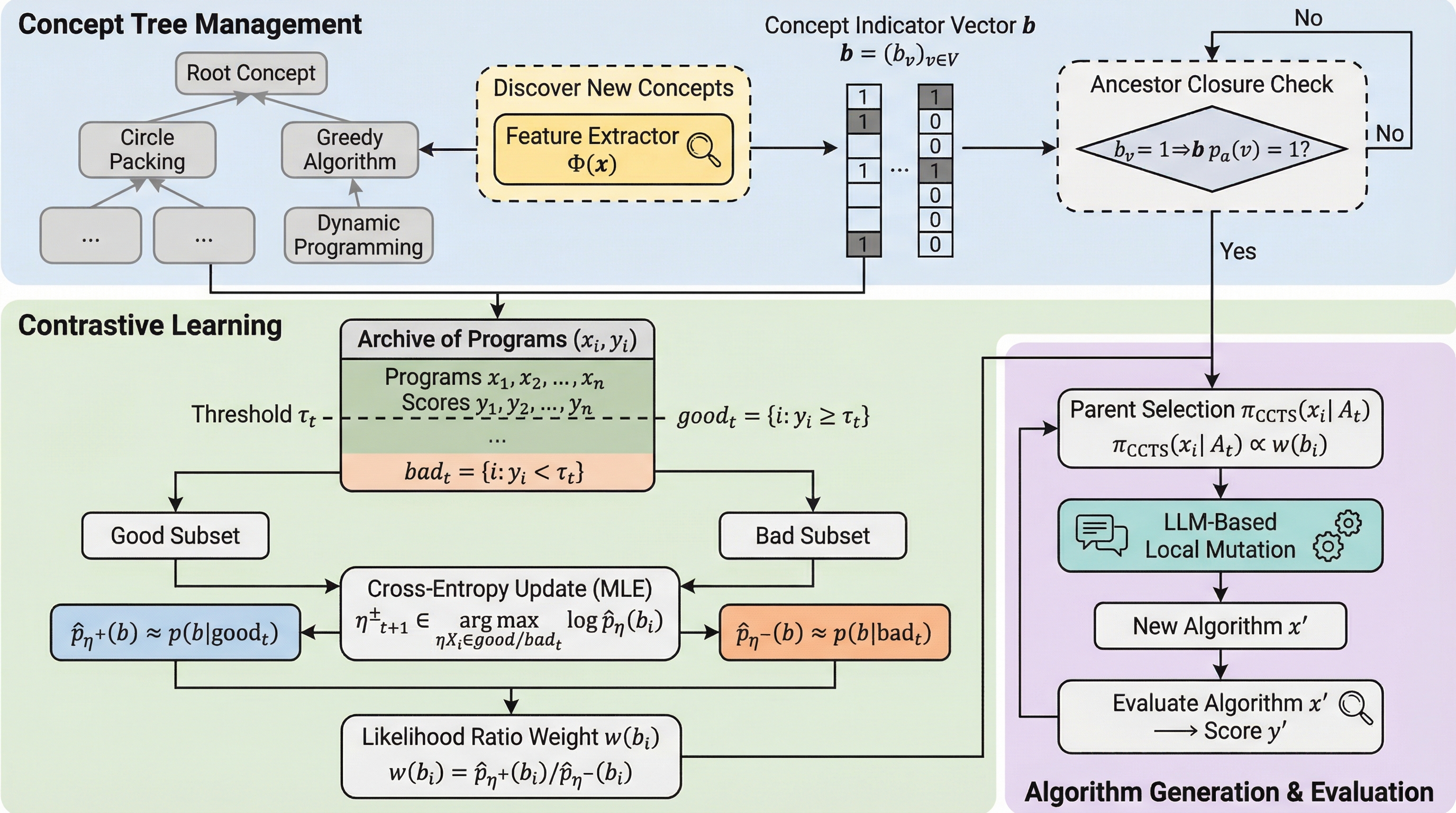 本研究では、アルゴリズム空間の潜在的な構造を明示化するために、アルゴリズムを階層的に組織化された意味的な概念空間の観点から記述できるという仮説を立てた。この階層構造において、各ノードは概念を表し、エッジは洗練または特殊化の関係をエンコードする。各概念はタスクの性能に対して正または負に寄与し、強力なアルゴリズムは有用な概念を組み合わせ、有害な概念を避けることで生まれると考える。このようなツリー構造の組織化は、科学的発見において自然なものである。 この仮説に基づき、本研究では「対照的概念ツリー探索(Contrastive Concept-Tree Search, CCTS)」を導入した。CCTSは、探索中にどの意味的概念を優先すべきかを学習する概念誘導型のアルゴリズム発見フレームワークである。…