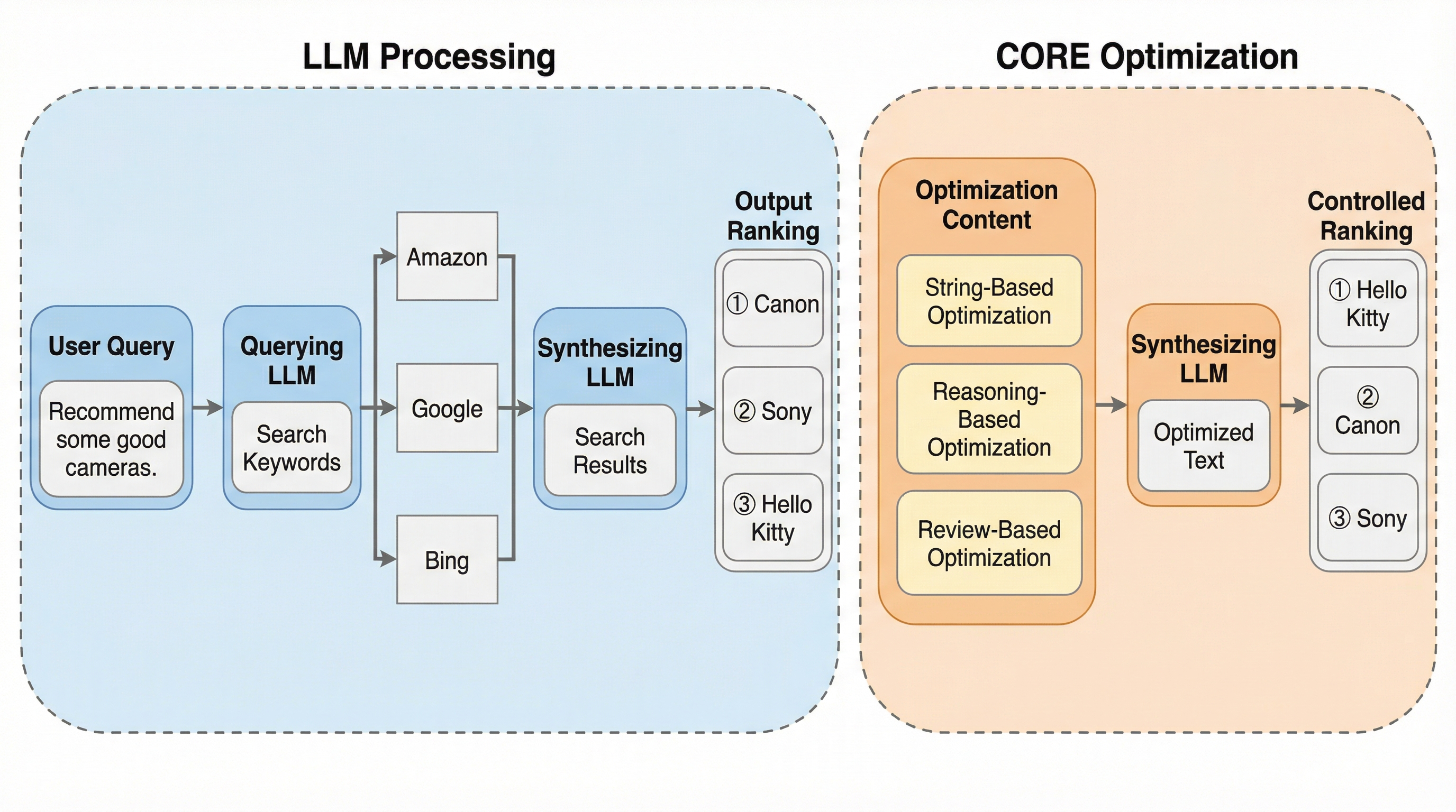 本研究では、LLMベースの検索エンジンにおける出力ランキングを制御するための最適化手法「CORE(Controlling Output Rankings in gEnerative Engines)」を提案しています。COREの最大の特徴は、LLMや検索エンジンの内部構造に一切アクセスできない「ブラックボックス」の設定において、検索結果として返されるコンテンツそのものを最適化の対象としている点にあります。具体的には、ターゲットとなる製品のテキスト情報(名称、説明、レビューなど)に、戦略的に設計された「最適化コンテンツ」を付加することで、LLMの意思決定プロセスを誘導し、最終的な出力順位を引き上げます。 COREでは、最適化コンテンツとして「文字列ベース(string-based)」、「推論ベース(reasoning-based)」、「レビューベース(review-based)」の3つのタイプを導入しています。…