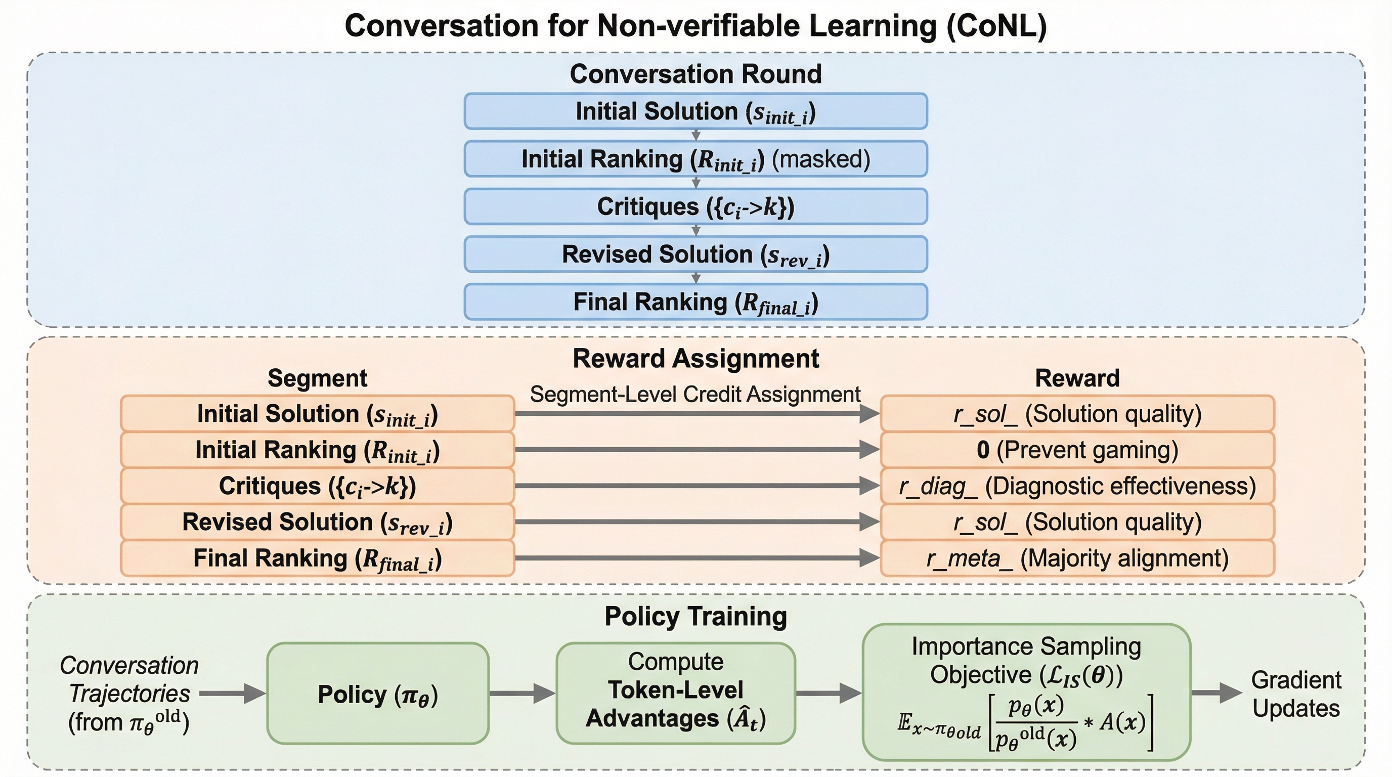 本研究は、生成、評価、メタ評価をマルチエージェントの自己対話を通じて統合するフレームワーク「CoNL(Conversation for Non-verifiable Learning)」を提案した。このアプローチの核心となる洞察は、批判の質は「それが他者の解決策を改善するのに役立ったかどうか」によって測定できるという点にある。…
