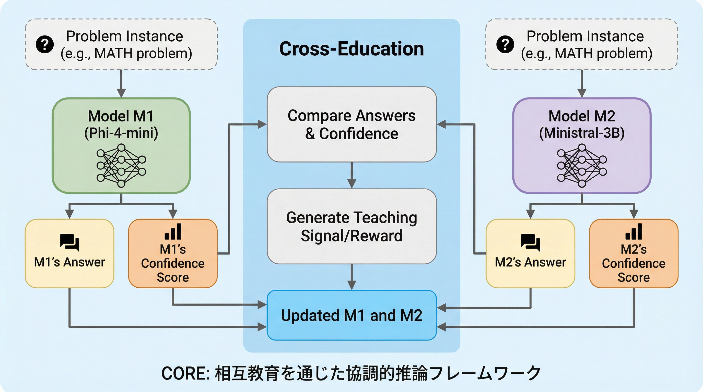 CORE(Collaborative Reasoning)は、複数の大規模言語モデルを訓練時に相互教育させることで、推論能力を飛躍的に向上させる新しい学習フレームワークである。 独立して問題を解く「コールドラウンド」と、成功した他者のヒントを元に解き直す「レスキューラウンド」の2段階構成により、モデル間の誤りの重複を減らし、相補的な能力を育成する。 わずか1,000例以下の学習データを用いた実験では、GSM8Kで99.54%、MATHで92.08%という極めて高いチーム正解率を達成し、モデルサイズを拡大せずに推論の信頼性を大幅に高めることに成功した。
