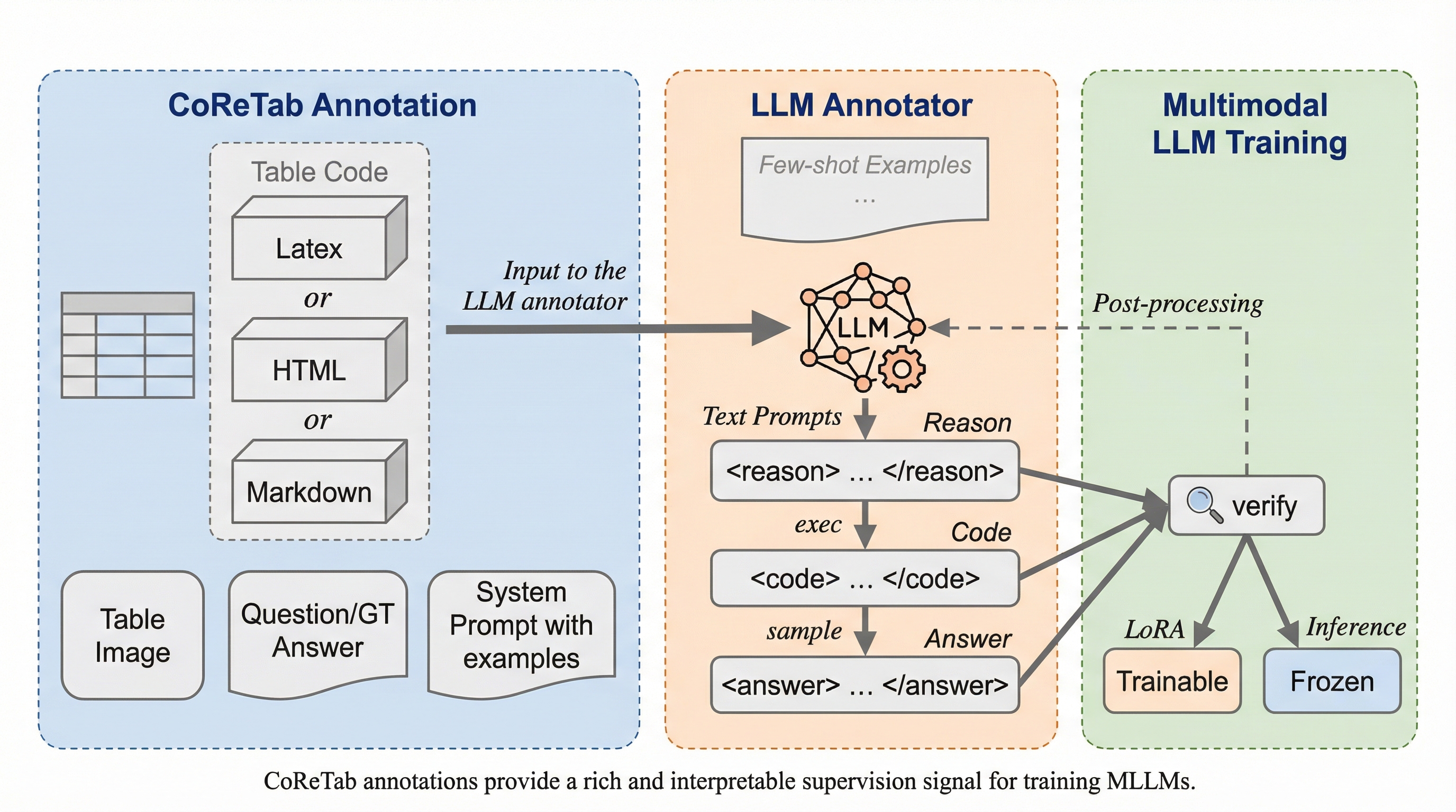 本研究では、マルチモーダルな表理解のためのコード駆動型推論フレームワークであるCoReTabを提案しました。このフレームワークの核心は、自然言語による多段階の推論ステップと、実行可能なPythonコードを密接に結合させる点にあります。これにより、推論の正しさをコードの実行結果を通じて自動的に検証することが可能となりました。具体的には、Qwen3 32B-3Aなどの強力なLLMアノテーターに対し、表のコード(HTML、LaTeX、Markdown)、質問、および正解の短答を入力として与え、多段階の推論過程とそれに対応するPythonコードを含む新しいアノテーションを生成させます。生成されたコードを実行し、その出力が元の正解と一致する場合のみをデータセットとして採用することで、高品質な教師データを確保しています。…