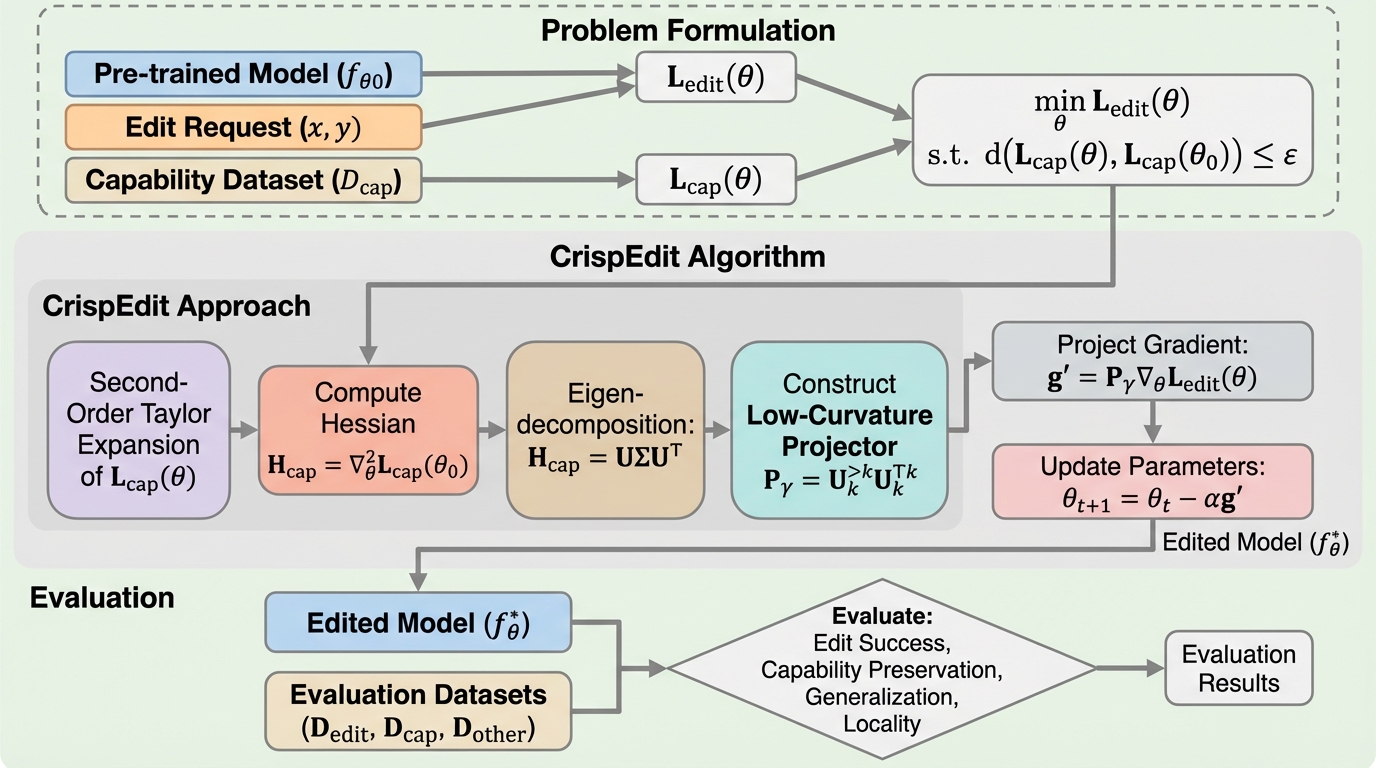 CrispEditは、編集が一見成功しても一般的な能力が静かに壊れるという「能力保持」の難しさを正面から扱い、能力の変化を小さく抑えることを明示的な制約として組み込む手法です。 / 編集を制約付き最適化として定式化し、能力損失の地形で曲率が小さい部分空間へ更新を射影して、能力に敏感な方向の更新成分を取り除く設計にしています。 / 標準的なモデル編集ベンチマーク全体で高い編集成功を保ちながら、データセット平均の能力劣化を1%未満に抑え、従来の編集器より編集と保持のトレードオフを大きく改善したと報告されています。