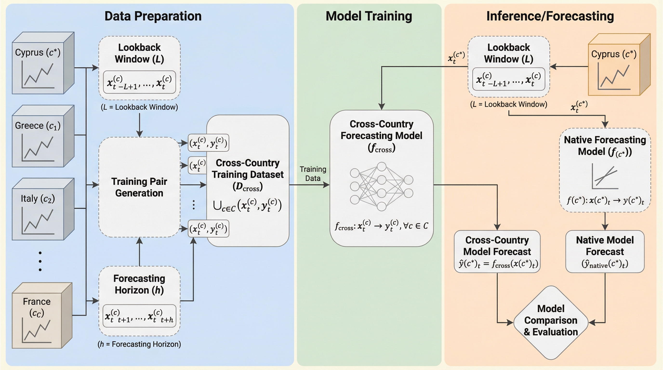 本研究の核心的な提案は、複数の国の時系列データを統合して単一の予測モデルを訓練し、特定の対象国の予測を行う「国境を越えた学習(クロス・カントリー学習)」フレームワークである。この手法は、国ごとに異なる疫学的な波の形状や変化の兆候を、共通の動態としてモデルに学習させることを目的としている。具体的には、欧州46カ国のCOVID-19監視データを活用し、キプロスを対象国としたケーススタディを通じて、他国のデータを「データ拡張」として利用する効果を体系的に検証した。このアプローチの利点は、特別なマルチタスク学習や複雑なグラフ構造のモデルを必要とせず、既存の機械学習アルゴリズムに対して他国のデータをプールして供給するだけで実現できる実用性の高さにある。…
