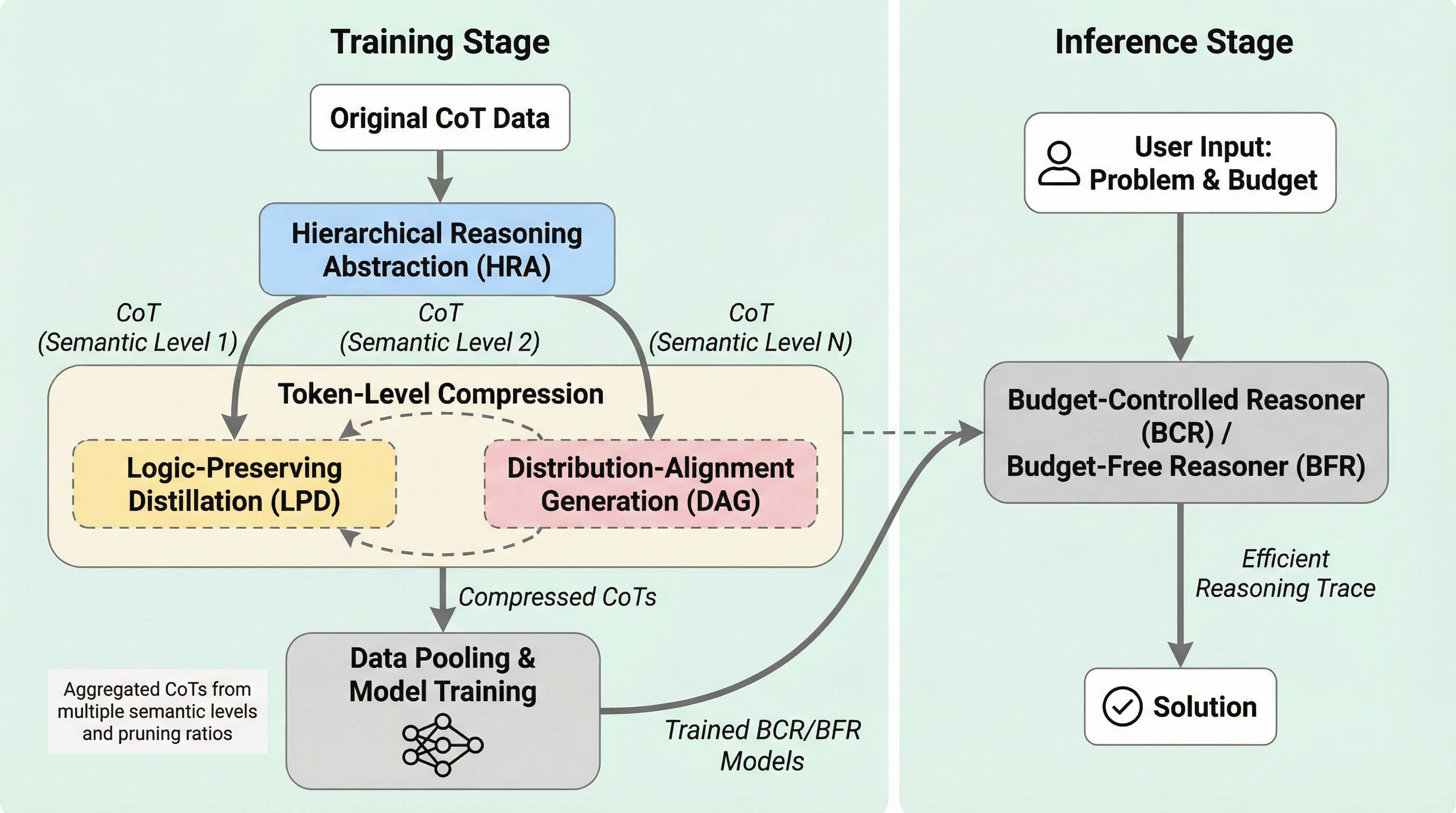 大規模言語モデルの思考の連鎖(CoT)における冗長性を排除するため、意味レベルの要約とトークンレベルの削減を統合した二重粒度フレームワーク「CtrlCoT」を提案し、推論精度を維持しながら計算コストを大幅に削減することに成功した。 論理構造を保護する蒸留プロセス(LPD)や生成分布を整合させる手法(DAG)を導入することで、MATH-500において既存手法より30.7%少ないトークン数で7.6ポイント高い精度を達成し、情報の欠落を防ぎつつ極めて高いトークン効率を実現している。 ユーザーが計算リソースに応じてトークン予算を指定できる「予算制御型推論器(BCR)」と、最適な長さを自動的に選択する「予算フリー推論器(BFR)」の両方を構築したことで、実用的な利便性と柔軟なリソース管理の両立を可能にした。