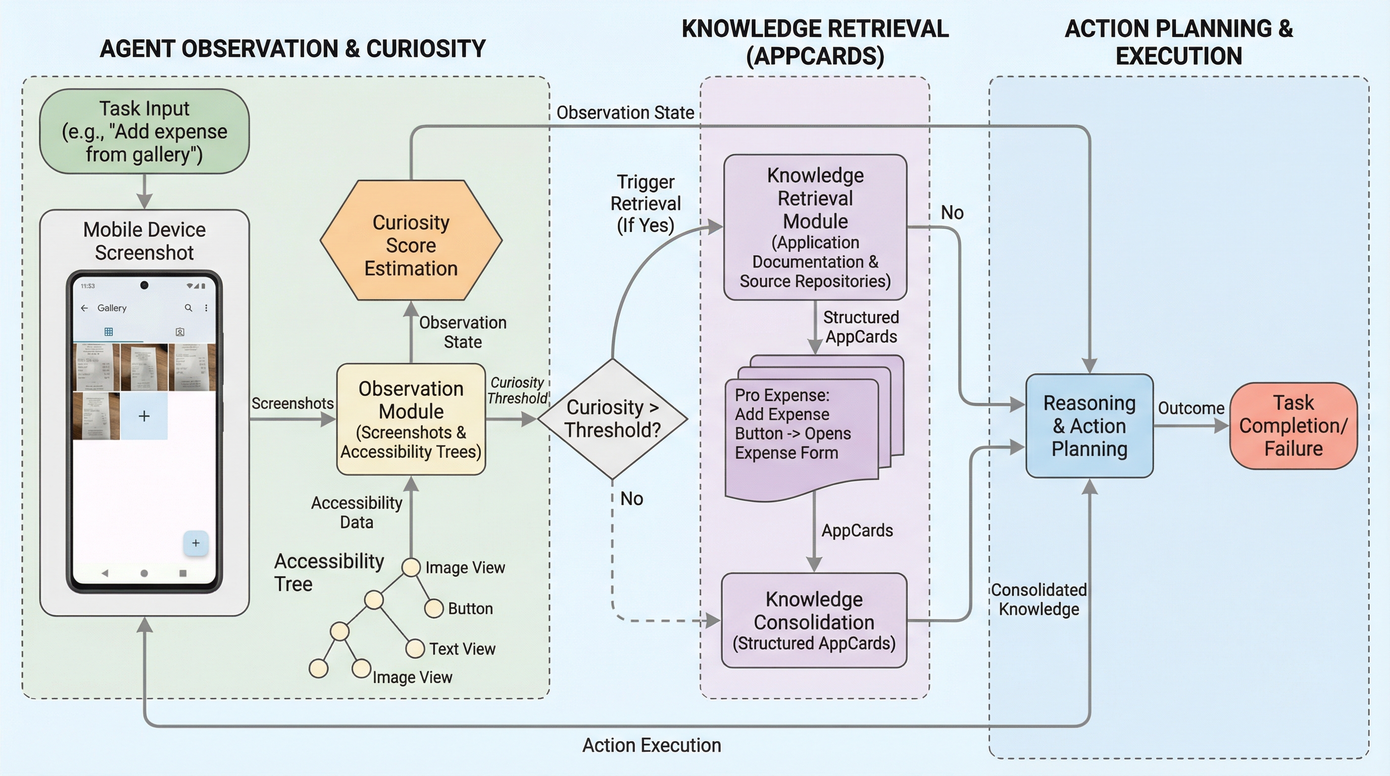 本研究では、モバイルエージェントの実行時における不確実性を「好奇心」として定式化し、必要に応じて外部知識を動的に取り入れる新しいフレームワークを提案している。この手法の核心は、エージェントが自身の知識不足を自覚し、その不足分を補うためにドキュメントやソースコードから情報を取得する仕組みにある。具体的には、実行中の予測と実際の観察結果の乖離を「好奇心スコア」として計算し、このスコアが一定の閾値を超えた際に外部検索をトリガーする。取得された情報は「AppCard」と呼ばれる構造化された形式に整理される。AppCardは、アプリケーションごとに作成されるモジュール化された知識ユニットであり、以下の4つの主要なコンポーネントで構成される。…