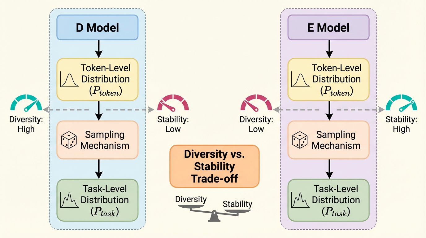 大規模言語モデル(LLM)の次トークン予測確率は、情報の関連性や商品の購入確率といったタスクレベルの目標分布($P_{task}$)と密接に関連していますが、そのサンプリング挙動には「Dモデル」と「Eモデル」という二極化された特性が存在することが明らかになりました。 Qwen-2.5などのDモデル(Deterministic)は、特定のトークンに確率が集中しステップごとの変動が激しい一方で、Mistral-SmallなどのEモデル(Exploratory)は確率分布が安定しており目標分布に対してより忠実なアライメントを示すという特徴を持っています。 これら二つのモデルタイプ間には多様性と安定性の体系的なトレードオフが存在しており、コード生成や推薦システムといった実世界のアプリケーションにおいて、不確実性を管理し信頼性を確保するためのモデル選択と構成に関する重要な指針を提供します。