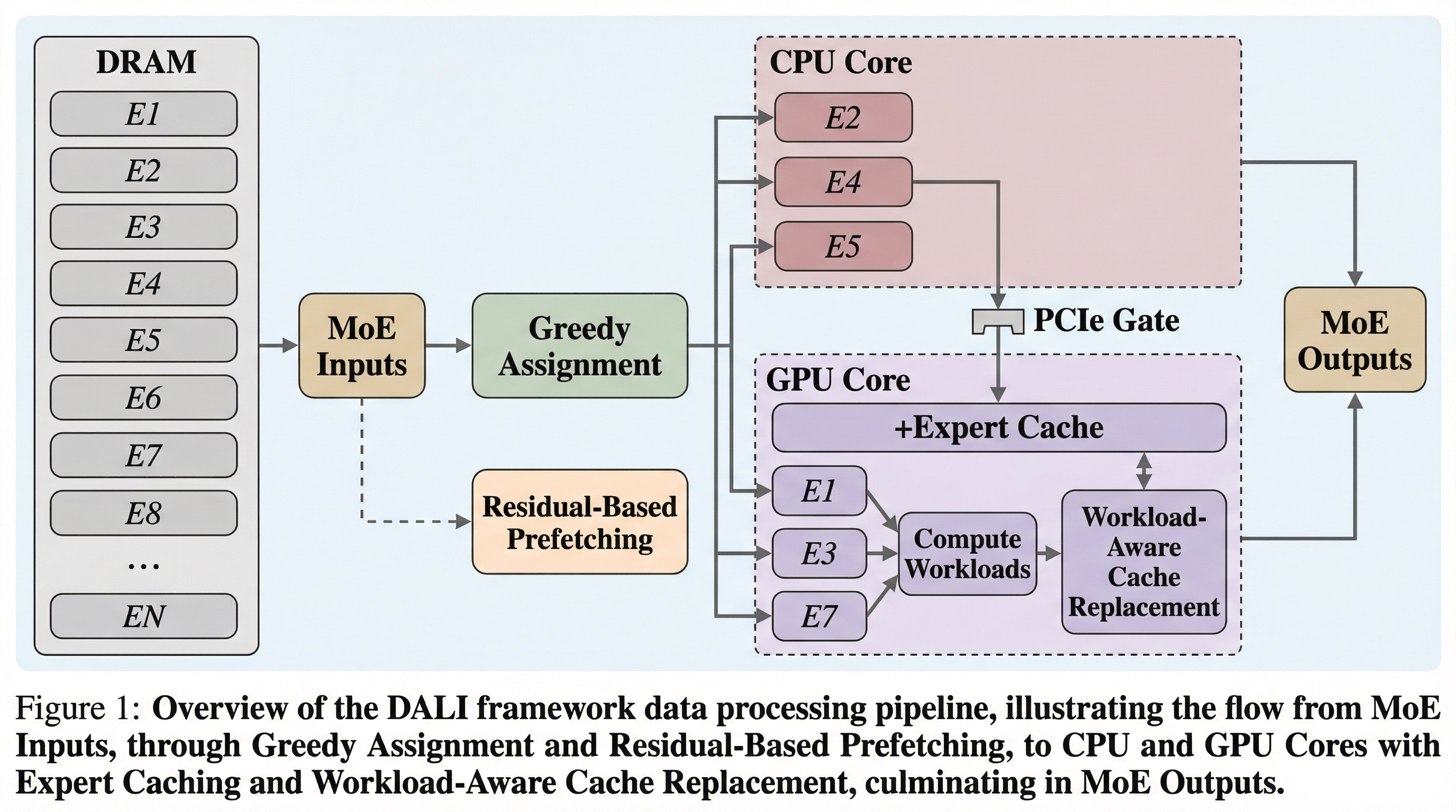 混合専門家(MoE)モデルの巨大なパラメータをローカルPCの限られたリソースで扱うため、CPUとGPUの計算資源を動的に最適化して併用する新しいオフローディングフレームワーク「DALI」が提案されました。