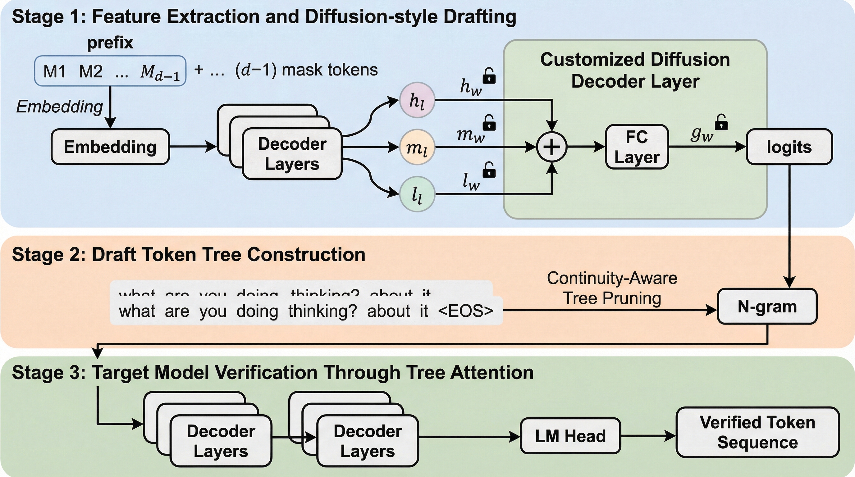 本研究では、拡散モデルの並列予測能力に着想を得つつ、投機的デコーディングの制約に最適化された新しいフレームワーク「DART」を提案しました。DARTの核心的なアイデアは、自己回帰的なロールアウトを完全に排除し、単一のフォワードパスで複数の未来のトークンに対するロジットを並列に予測することにあります。これにより、ドラフトの長さに関わらずドラフト作成の遅延を一定かつ極めて低く抑えることが可能になりました。DARTは、ターゲットモデルと密に結合した非常に軽量な設計を採用しています。具体的には、ターゲットモデルの中間層から得られる隠れ状態を再利用し、その上にカスタマイズされた単一のトランスフォーマーデコーダー層を追加するだけで構成されています。この設計により、ドラフトモデルを独立して動かす場合の計算コストや、トークナイザーの不一致といった実務上の問題を回避しています。…
