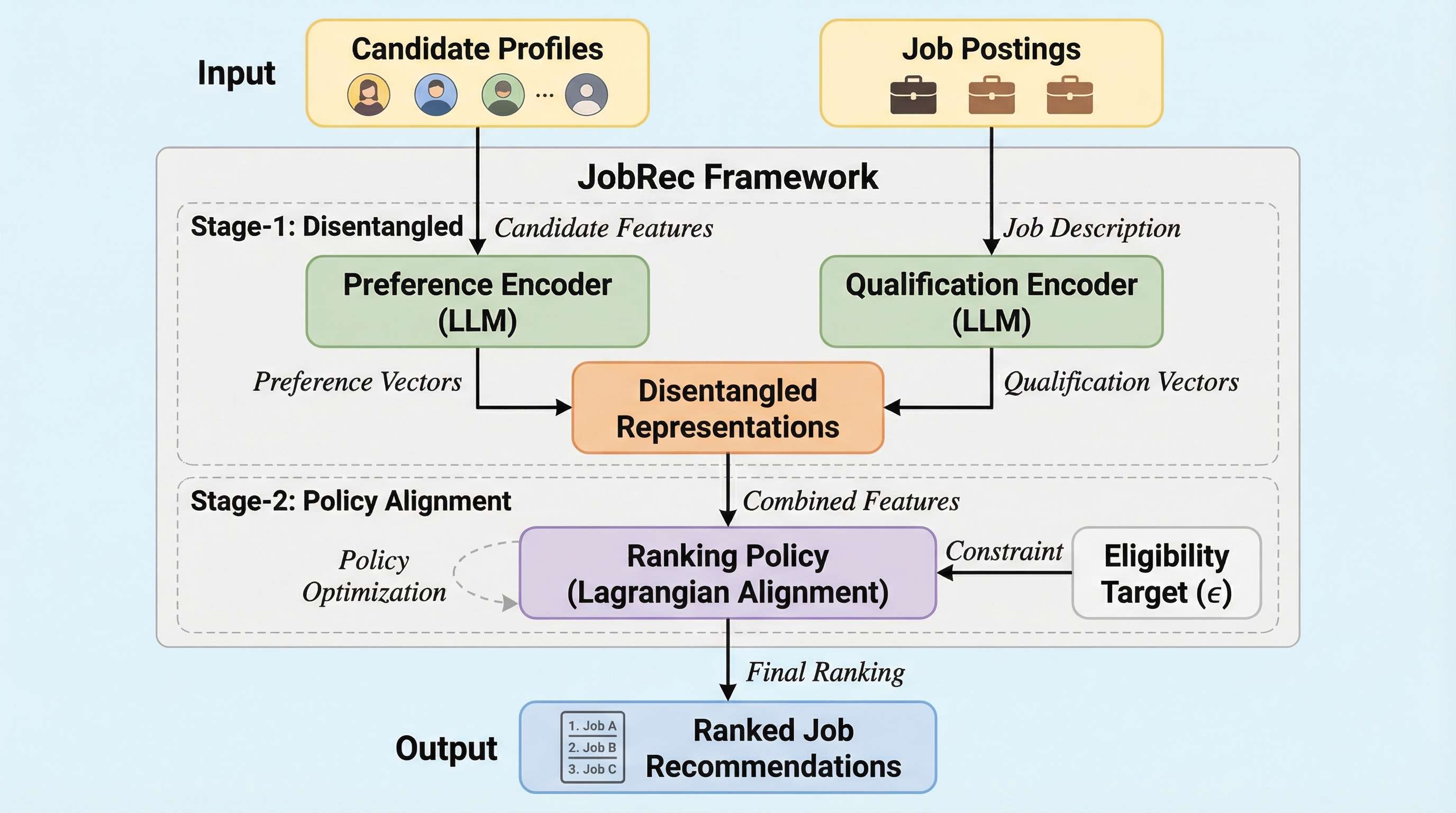 従来の求人推薦システムは大言語モデル(LLM)を用いても、候補者の主観的な「嗜好」と雇用主の客観的な「資格」という異なる性質の信号を単一の指標に統合してしまい、適切なマッチングや制御が困難であるという課題があった。本研究が提案する「JobRec」は、情報を4つの層に整理する統一セマンティックアライメントスキーマ(USAS)と、嗜好と資格を個別に推論する専門家モデルを学習する二段階協調トレーニング戦略により、これら二つの視点を明確に分離して扱う。ラグランジュ未定乗数法に基づく方策アライメントを導入することで、候補者の関心を最大化しつつ雇用主の資格要件を厳格に満たす制御可能な推薦を実現し、既存のLLM手法や深層学習モデルを大幅に上回る性能を実証した。
