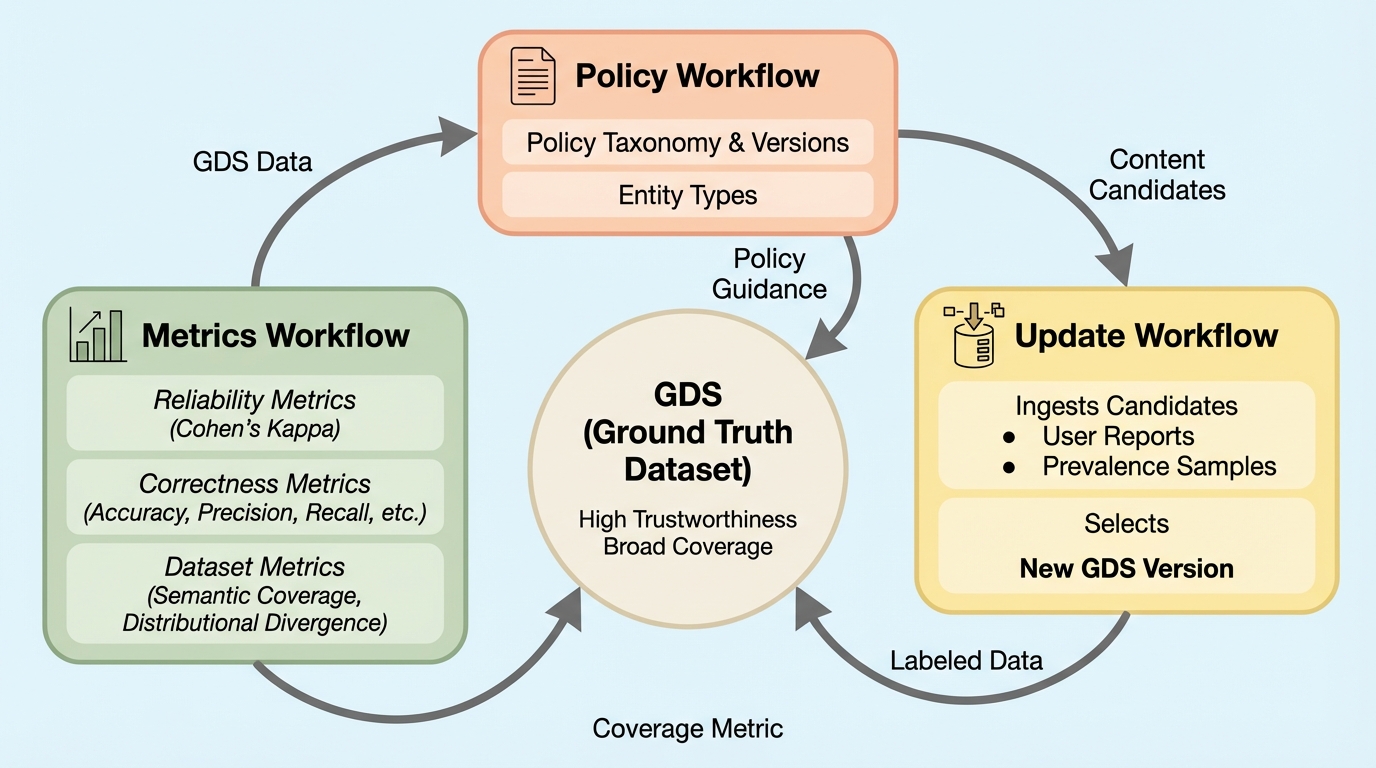 オンラインプラットフォームがコンテンツ安全性ポリシーを大規模に執行するには、機械学習モデル、スケーラブルな人手ラベリング、そしてLLMを組み合わせた運用が必要になります。ここで致命的になりやすいのが、「判断が正しいか」を測る評価の不安定さです。ポリシーは曖昧さや複雑さを含みやすく、人手でも自動でも解釈の揺れが起き、同じ対象でも異なる結論になり得ます。さらに、ポリシーは運用しながら更新されるため、いつの版の解釈で付けたラベルなのかが曖昧になると、経時比較自体が崩れます。加えて、問題となるコンテンツが極端に希少である点も評価を難しくします。ランダムに集めたデータでは重要なエッジケースが十分に入らず、オフライン評価で良く見えても本番で崩れる状況が起き得ます。 論文はこの状況を、信頼性とスケールのトレードオフとして「Pyramid of Truth」に整理しています。頂点のSMEは最も信頼できる一方で高コストかつ供給が限られ、底辺のスケーラブルなエージェント(大規模な人手チーム、LLM、MLモデルなど)は量を出せても信頼性が下がります。…