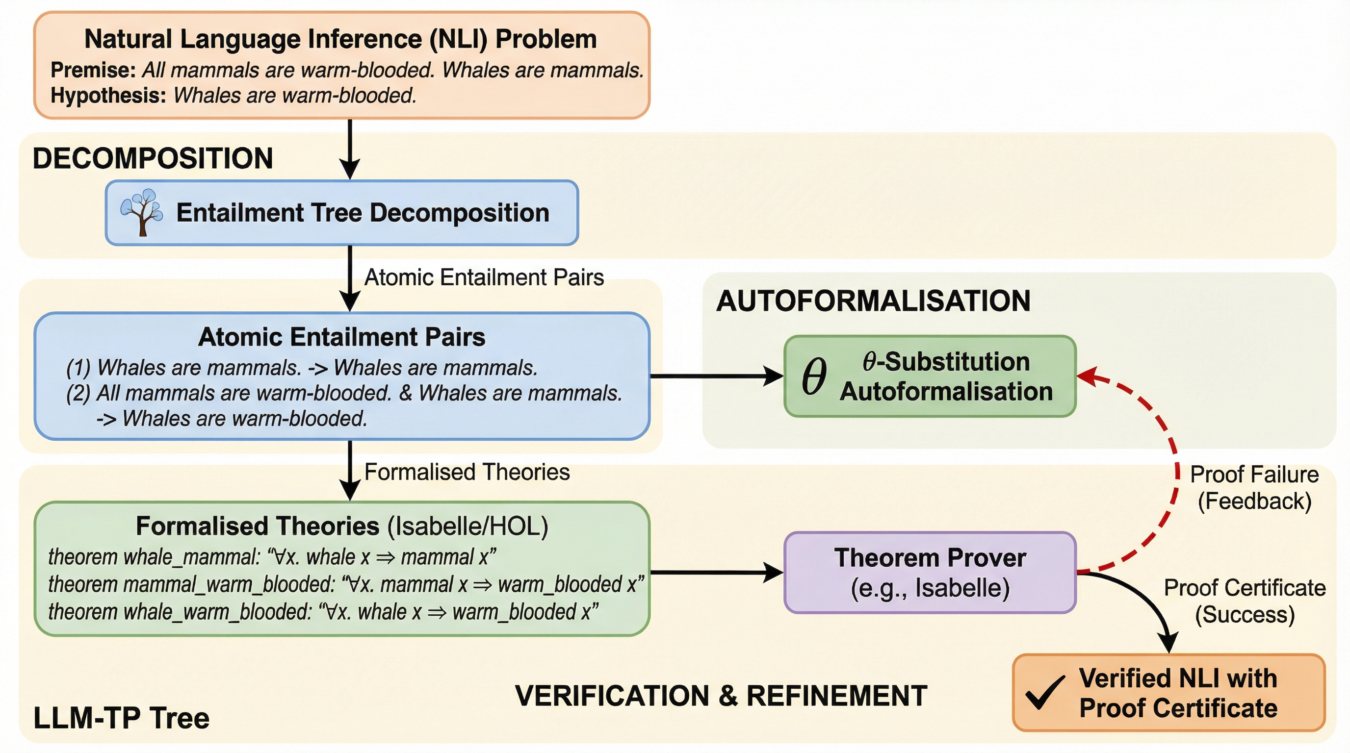 自然言語推論において、大規模言語モデルと定理証明器を統合する際の課題であった、長文や複雑な構文に起因する形式化エラーと、それによる推論チェーン全体の破綻を解決するため、推論過程を「含意ツリー」として構造化し、各ステップを最小単位の命題に分解して再帰的に検証・修正するフレームワーク「LLM-TP Tree」を提案しました。 この手法では、文を最小単位に切り分ける「原子的分解」と、イベントベースの論理形式で意味的な役割結合を厳密に管理する「$\theta$置換」を導入することで、定理証明器との互換性と元の文章への忠実性を両立させ、失敗した箇所のみを特定して局所的に修正する効率的なプロセスを実現しています。 5つの最新の大規模言語モデルを用いた評価の結果、従来手法と比較して検証成功率を最大48.9%向上させ、修正のための反復回数や実行時間を大幅に削減しながら、高い推論精度を維持することに成功し、複雑な多段階推論を論理的に厳密な形で検証できる実用的な可能性を示しました。